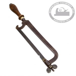 На меньшей пиле надписей нет (или мы их не видим). Малая пила похожа на большую, но установить, родственники ли они пока не удалось… Обе рамки — кованные. Точёные рукояти обеих пил выполнены из палисандра дерева.