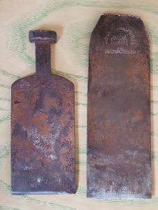 Отдельно расскажем о ноже. Он значительно уже, чем нужно для такого летка. Стружколом — от ножа совсем другой формы. По-видимому, фуганок перед отправкой нам укомплектовали теми железками, которые были под рукой. Но всё это компенсируется происхождением ножа. На нём чётко читается клеймо с изображением рубанка и буквами J.A.BS и надпись J.A.BRAUSCHWEIG IN REMSCHEID. В нашем музее есть информация об этой фирме и несколько инструментов с её клеймами.