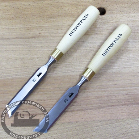 Косые стамески ПЕТРОГРАДЪ. Угол наклона РК по отношению к оси стамески - 30 градусов. Длина полотна - 130мм; ширина - 6мм, 12мм, 20мм, 26мм. Общая длина - от 265мм. Полотно выполнено из инструментальной хром-марганцевой высоколегированной стали и закалено до твердости 60HRc. Рукоять выполнена из древесины граба. Рукоять без покрытия - мастер сам выбирает покрытие. В комплекте - пластиковый наконечник для защиты РК. Рукоять в месте соединения с полотном укреплена латунным кольцом с кожаной прокладкой.Производство - Европа.