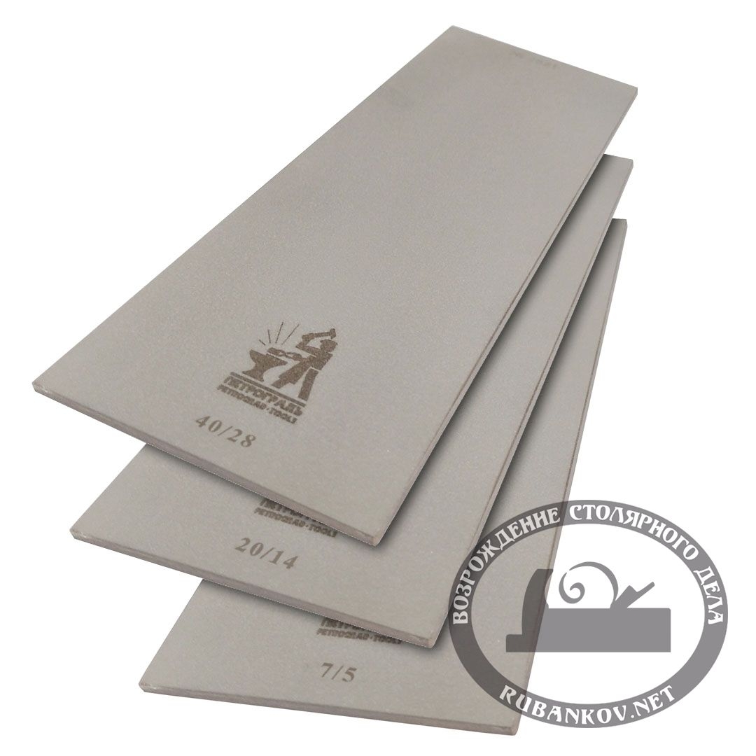 Алмазные бруски нет необходимости замачивать в воде перед использованием, как это необходимо делать с водными абразивами, но работать на алмазных камнях строго рекомендуется с хонинговальным маслом или водой. Алмазные камни являются монолитными шестисторонними брусками, следовательно 6 сторон камня - рабочие. На сегодня выпускаются три различных по агрессивности алмазных камня: 7/5мк (2000грит); 20/14мк (600грит); 40/28ик (300грит)