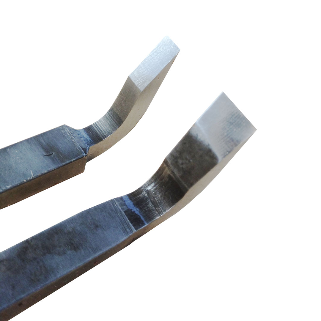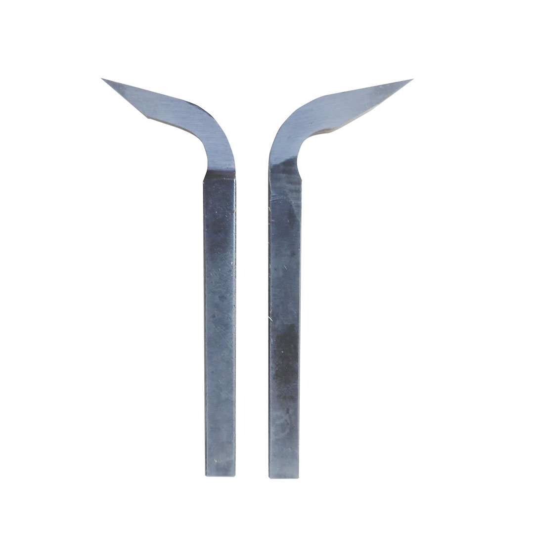 Два ножа L-образной формы, 6мм и 12мм угол заточки 25°. Нож выполнен из инструментальной стали и закален до твердости 58-61HRC. Заточены и готовы к работе. Зажимной винт выполнен из латуни, при зажатии не портит тело ножа и придает изысканный вид инструменту. Нож переставляется в два положения, позволяя работать рубанком как с открытым бортом, так и с закрытым.