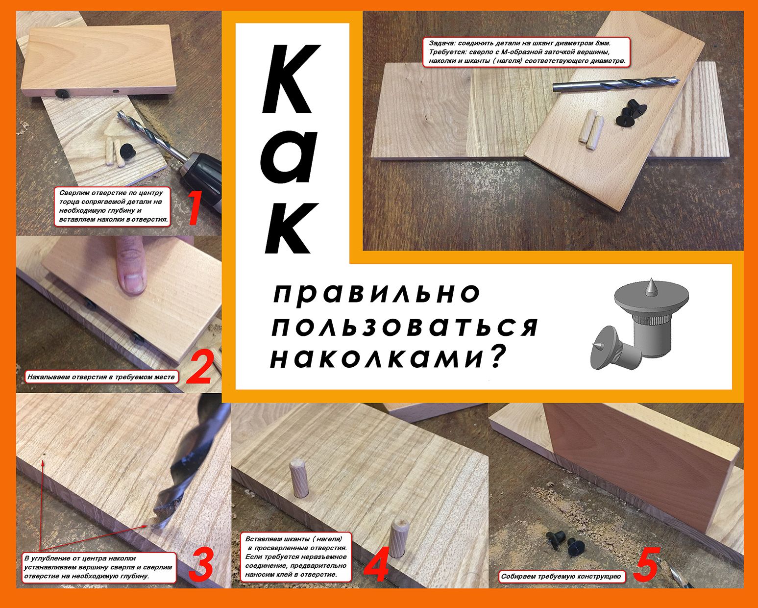 Кернеры (наколки) для мебельных шкантов. Производство - фабрика столярных и плотницких инструментов ПЕТРОГРАДЪ. Диаметр кернеров: 5 мм, 6 мм, 7 мм, 8 мм, 10 мм, 12 мм. Кернер нужного диаметра вставляется в просверленное отверстие под шканты, после чего проводится разметка ответных отверстий.