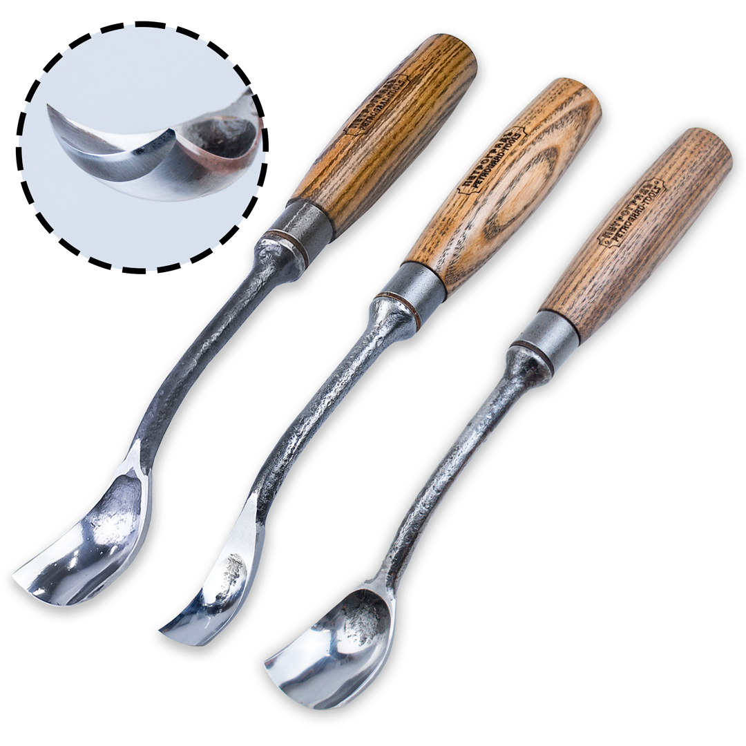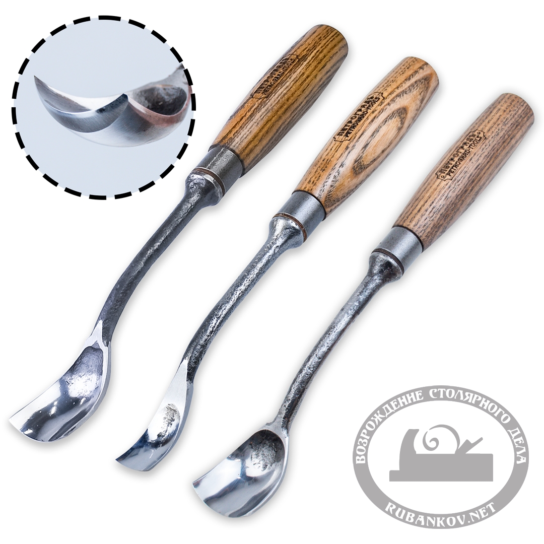 Стамески для резьбы по дереву Петроградъ откованы из низколегированной высокоуглеродистой стали. Закалены до твёрдости 59-61 HRc. Внутренний профиль стамески отполирован, режущая кромка заточена и готова к работе.
