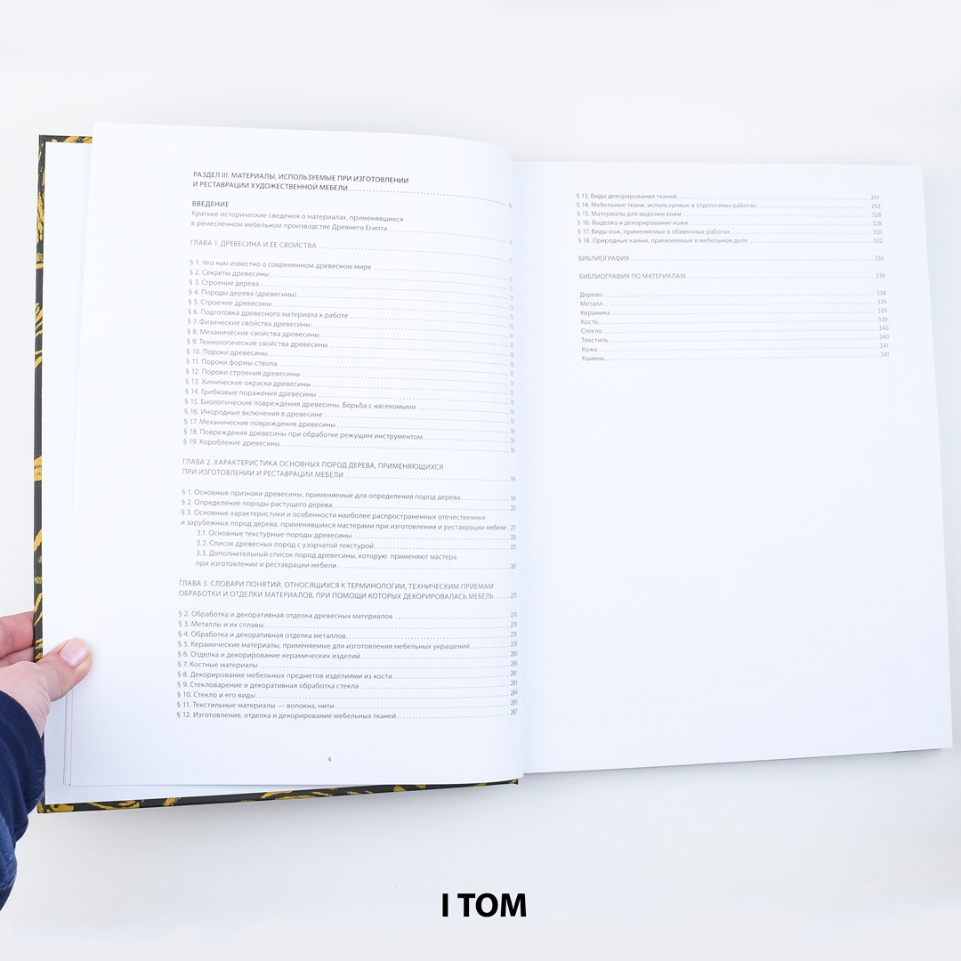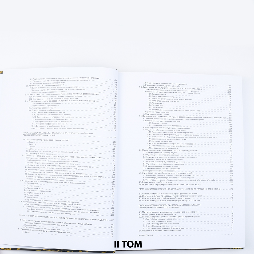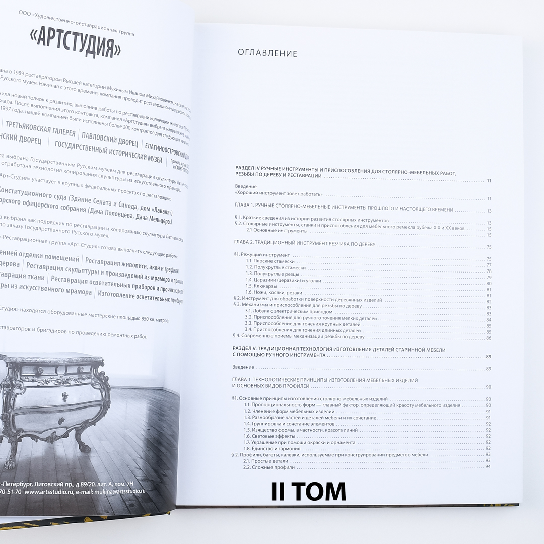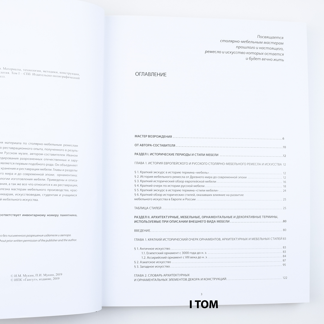 Настоящий труд является плодом многолетнего собирания материала по столярно-мебельным ремеслам и искусствам, а так же фиксирование собственного богатого реставрационного опыта, полученного в результате работы над памятниками искусства в Государственном Русском музее, автором-составителем Иваном Михайловичем Мукиным. До сего дня попыток энциклопедирования разрозненных отечественных и зарубежных источников никто не предпринимал, и данный труд является первым подобного рода. Он объединяет практически все аспекты, касающиеся создания, бытования, хранения и реставрации мебели. Главы и разделы объединены по темам: