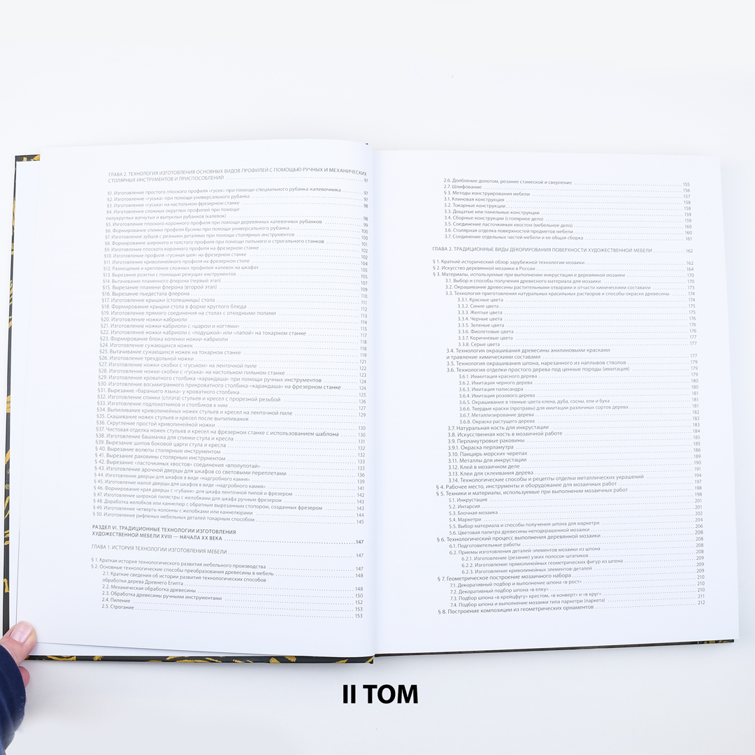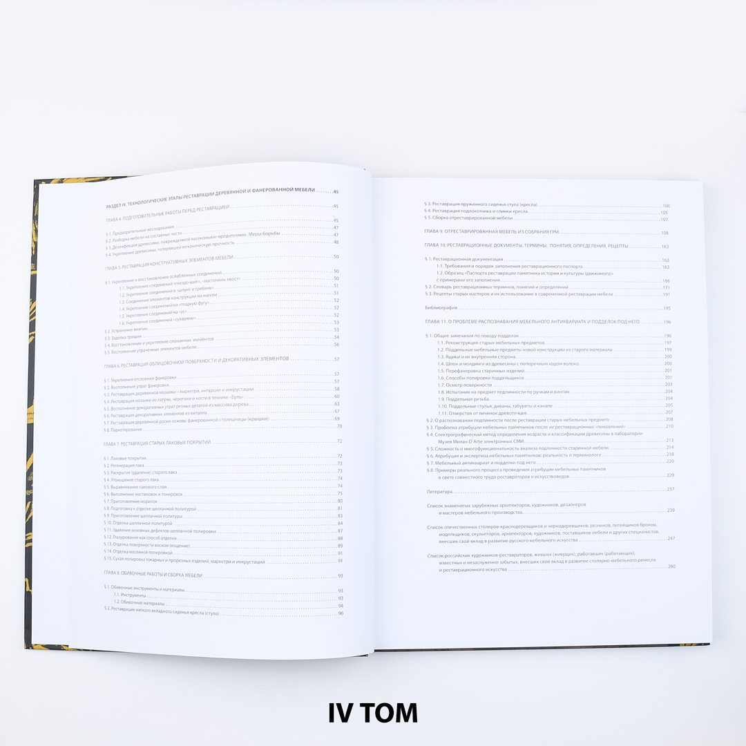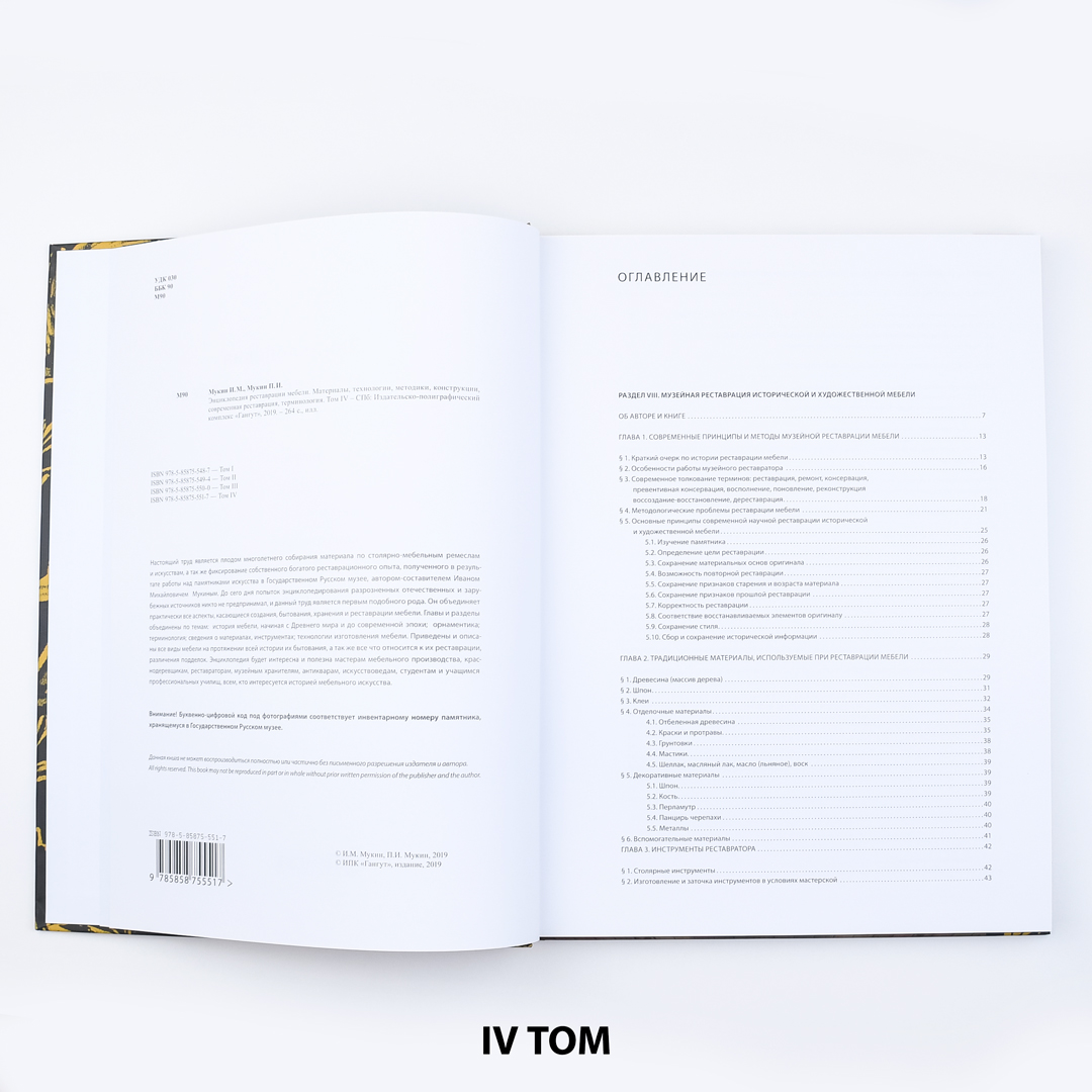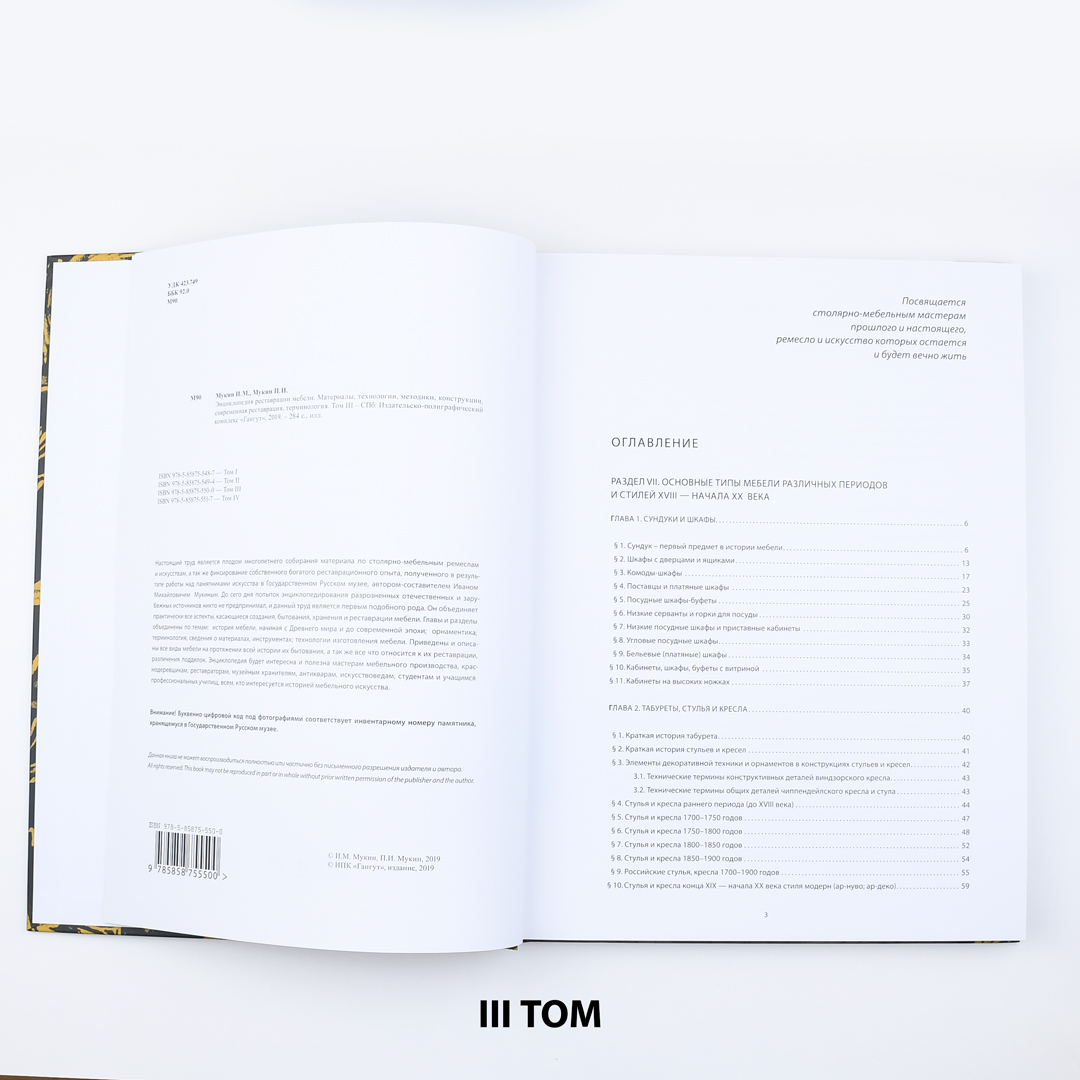 Настоящий труд является плодом многолетнего собирания материала по столярно-мебельным ремеслам и искусствам, а так же фиксирование собственного богатого реставрационного опыта, полученного в результате работы над памятниками искусства в Государственном Русском музее, автором-составителем Иваном Михайловичем Мукиным. До сего дня попыток энциклопедирования разрозненных отечественных и зарубежных источников никто не предпринимал, и данный труд является первым подобного рода. Он объединяет практически все аспекты, касающиеся создания, бытования, хранения и реставрации мебели. Главы и разделы объединены по темам: