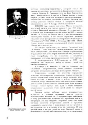 Пик мебелестроения, переход от штучного изготовления мебели к фабричному производству.В богато иллюстрированной книге Генриха Гацура изложена история одного из самых интересных периодов в мебельном искусстве России и Европы. Поиск нового стиля. Начало эпохи массового производства мебели. Книга содержит большое количество интересной информации ранее не публиковавшейся в России. В альбоме широко представлена мало описанные в нашей литературе мебель и интерьеры в стилях второго рококо и псевдорококо, второго ампира, псевдоренессанса, псевдобарокко, псевдоготики, русский и псевдорусский стиль и т.д.. Редкие гравюры, эскизы, материалы из оставшихся в единичных экземплярах каталогов мебельных фирм того периода. Даны образцы фурнитуры, декора, станки и инструменты второй половины 19 века. Словарь названий, терминов, списки мебельных фирм, российских и зарубежных мастеров, фабрикантов, архитекторов, дизайнеров, поставщиков Императорского Двора, меценатов и крупных заказчиков 19 века. Хронология российских, международных и всемирных художественно-промышленных выставок 18-19 веков, в которых принимала участие Россия, время внедрения наиболее известных изобретений и новых технологий в производство мебели и т.д, и т.д.