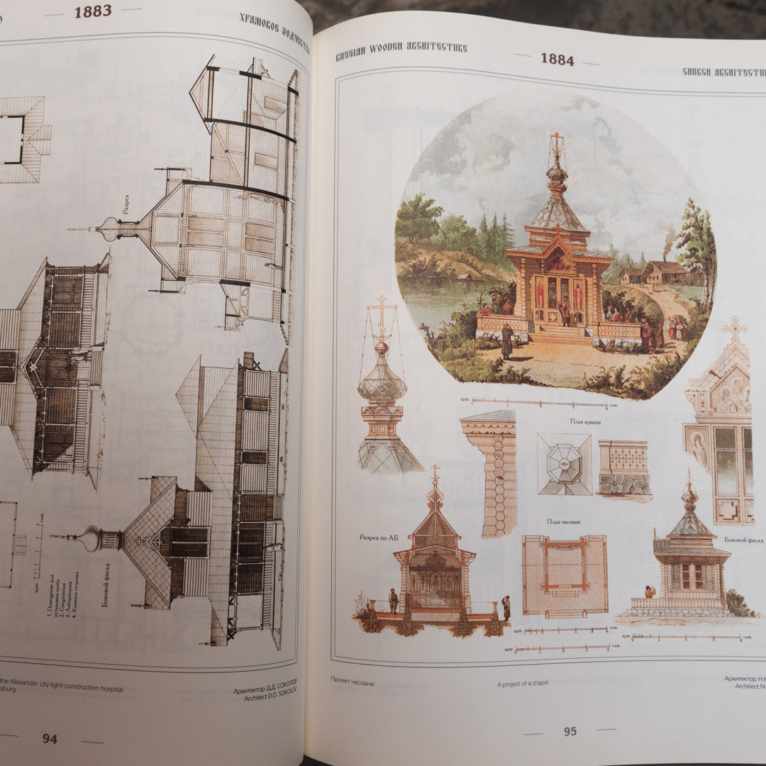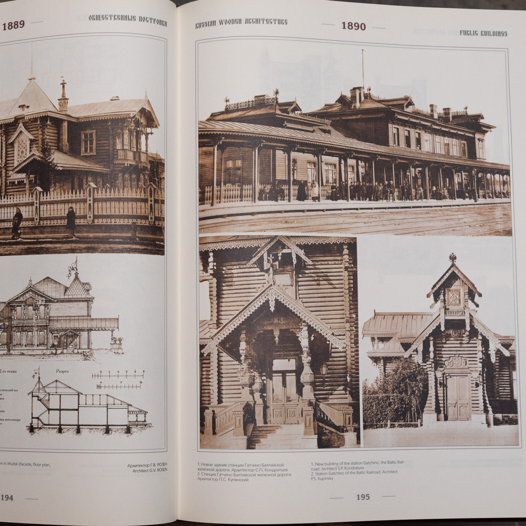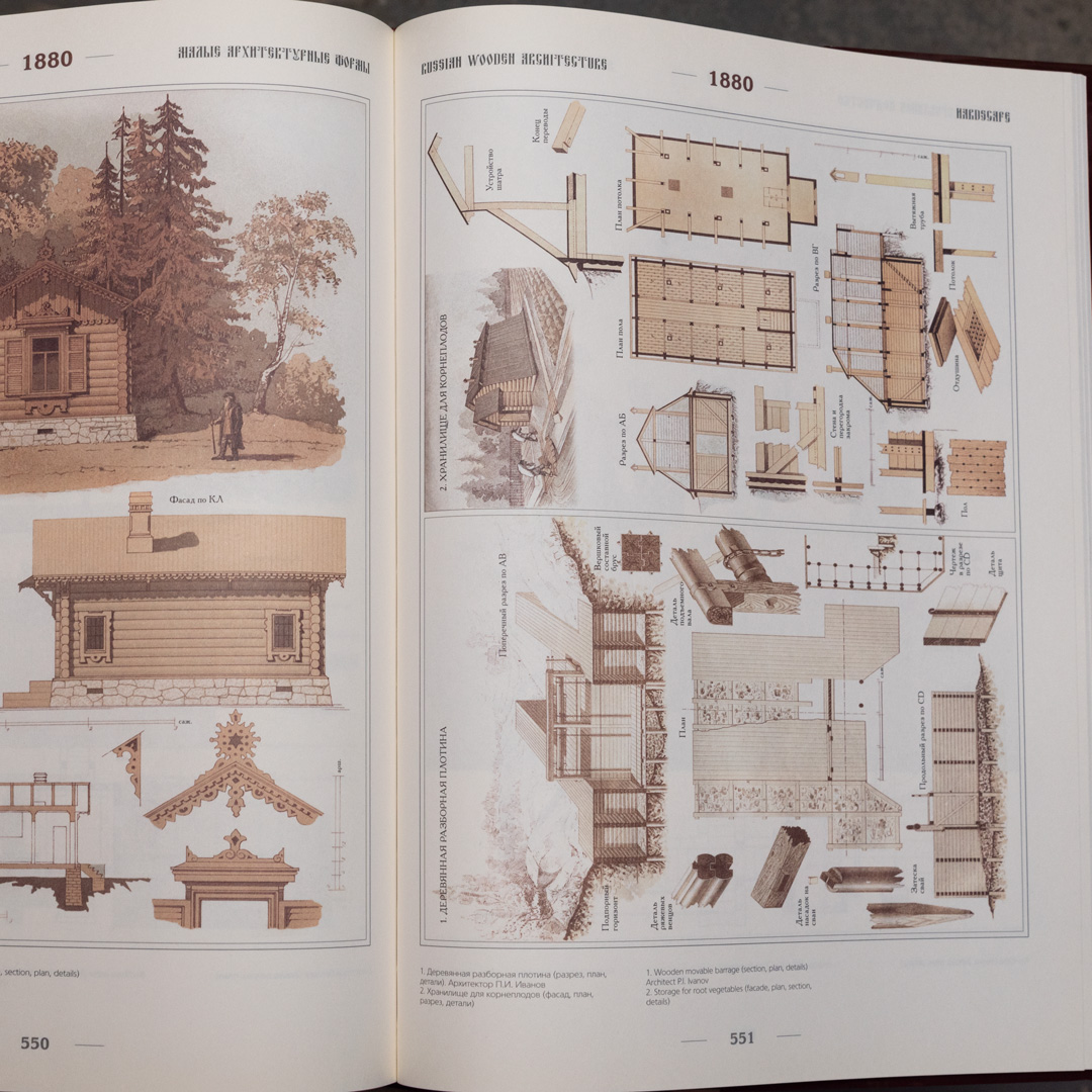 Уникальная в своем роде книга "Русское деревянное зодчество XIV-XX веков". Книга содержит огромное количество иллюстраций с примерами деревянного зодчества России. Тут собраны всевозможные общественные здания, торговые палаты, загородные дома, дачи, выставочные павильоны, бараки, храмы музеи, концертные залы и многое другое. И все эти здания когда-то были полностью выполнены из дерева при помощи одних только ручных инструментов. Помимо архитектуры в книге так же собраны уникальные примеры интерьеров и предметов быта.