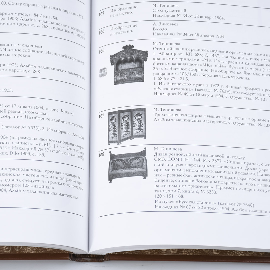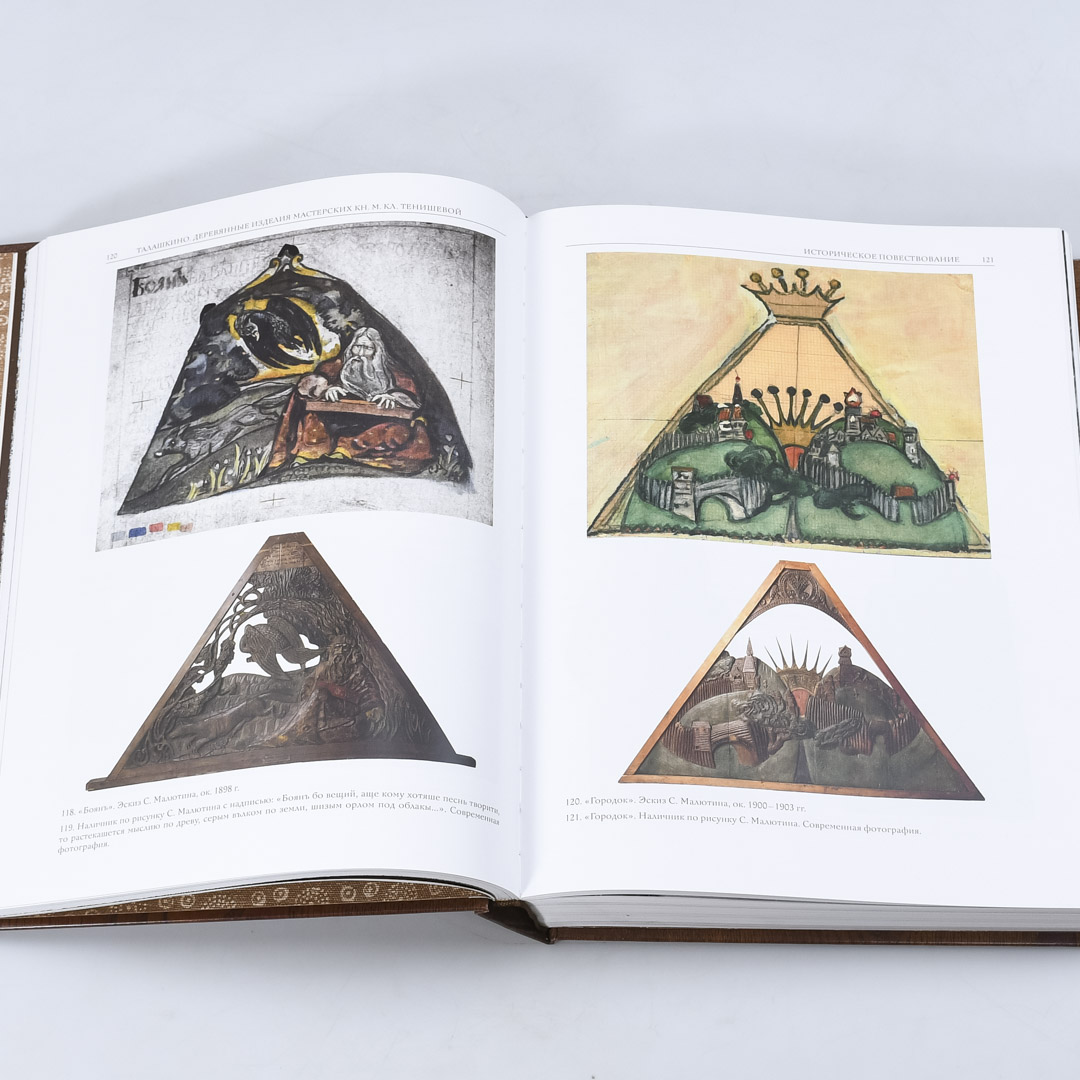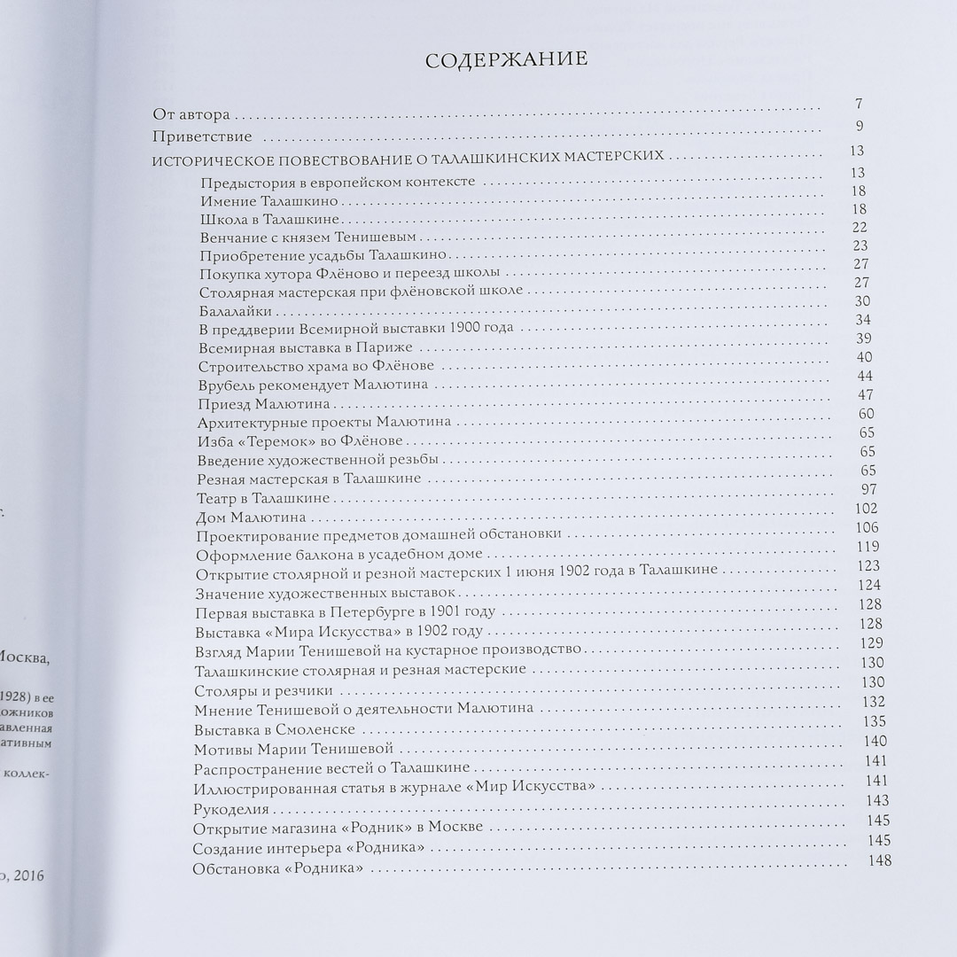 Книга посвящена истории и изделиям столярной и резной мастерских, открытых кн. М. Тенишевой (18581928) в ее смоленском имении Талашкино. Здесь с 1900 по 1905 годы, по рисункам М. Тенишевой и приглашенных ею художников создавалось разнообразие высокохудожественных предметов мебели, домашней и церковной утвари. Вся представленная в настоящем издании информация основана на документальных источниках и дополняется богатейшим иллюстративным материалом: эскизами и фотографиями начала XX века, современными снимками.