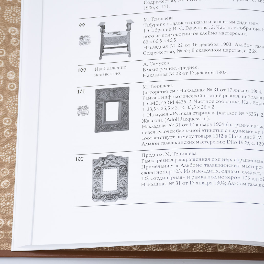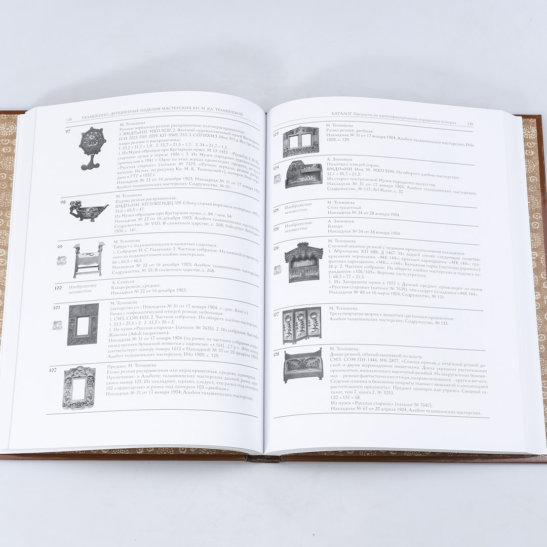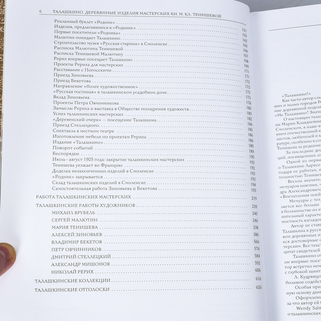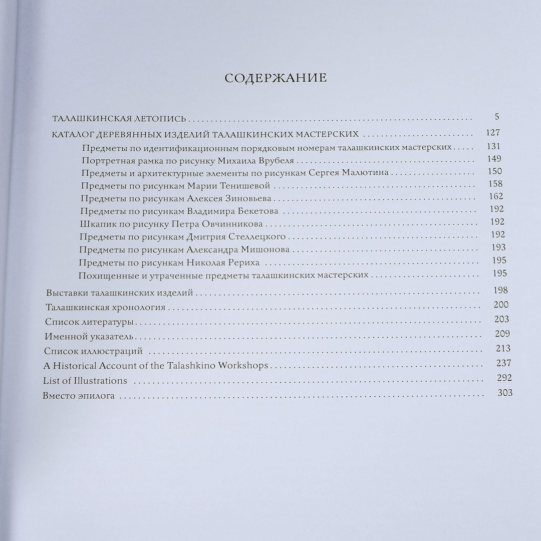 Книга посвящена истории и изделиям столярной и резной мастерских, открытых кн. М. Тенишевой (18581928) в ее смоленском имении Талашкино. Здесь с 1900 по 1905 годы, по рисункам М. Тенишевой и приглашенных ею художников создавалось разнообразие высокохудожественных предметов мебели, домашней и церковной утвари. Вся представленная в настоящем издании информация основана на документальных источниках и дополняется богатейшим иллюстративным материалом: эскизами и фотографиями начала XX века, современными снимками.