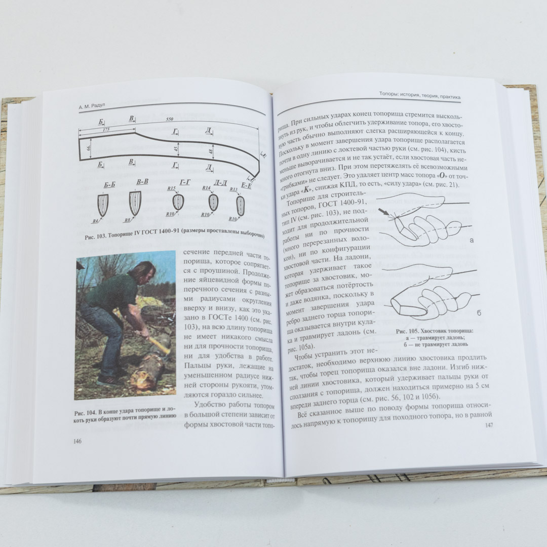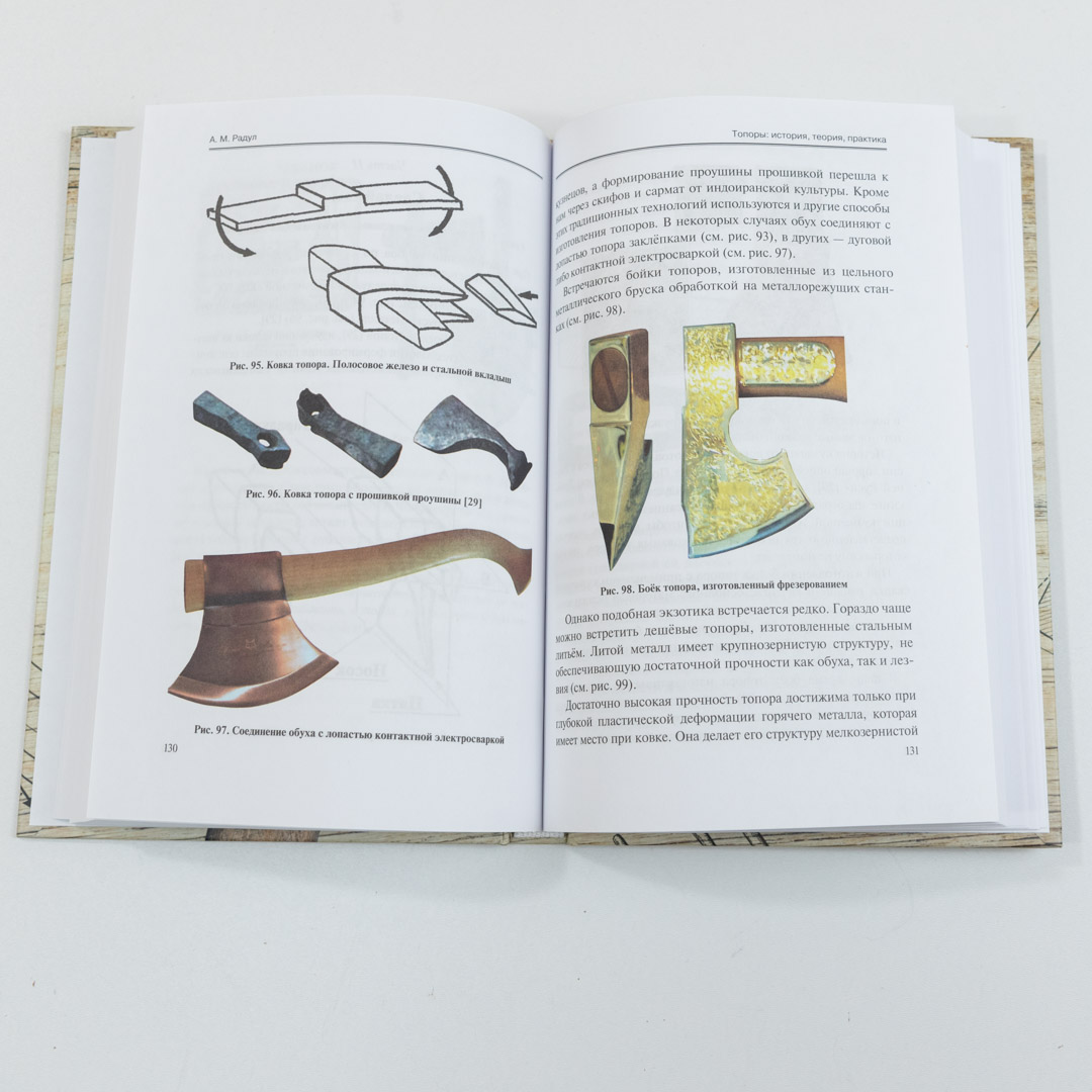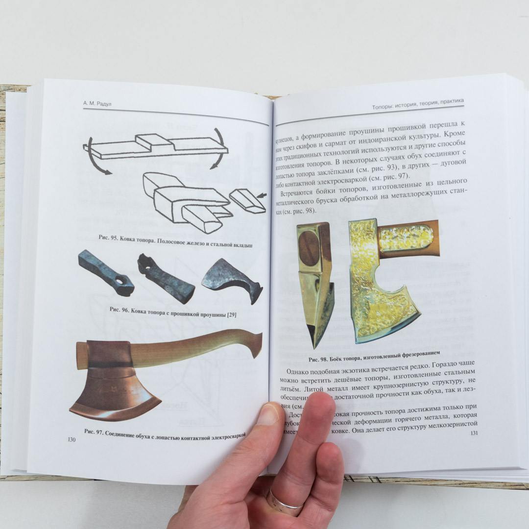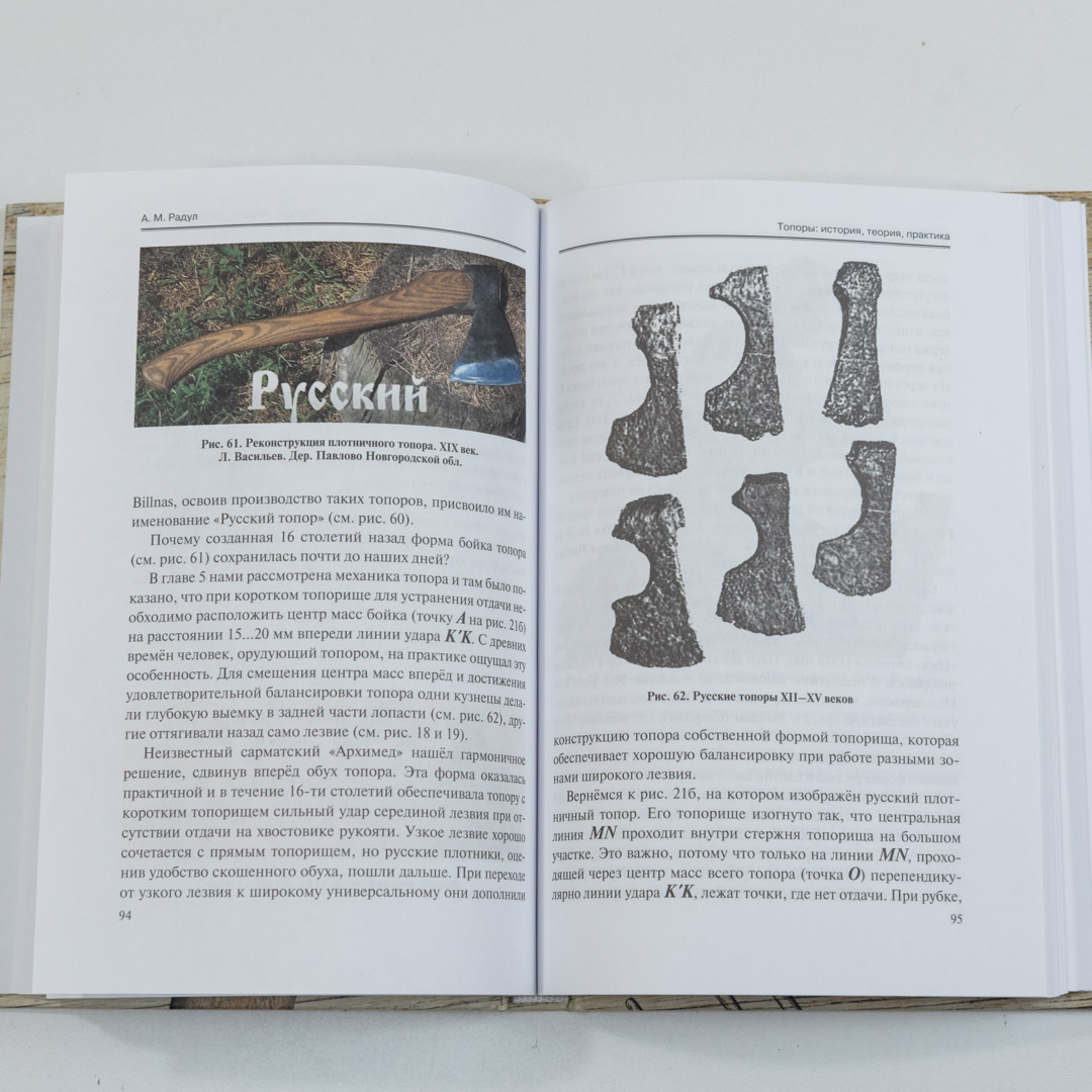 Книга «Топоры. История, теория, практика» Радул.А.М. (издание 3б исправленное и дополненое) В книге описывается история топора, начиная с каменного века. Применительно к топору возрождается подзабытая с тридцатых годов прошлого века теория механики ручных орудий труда.