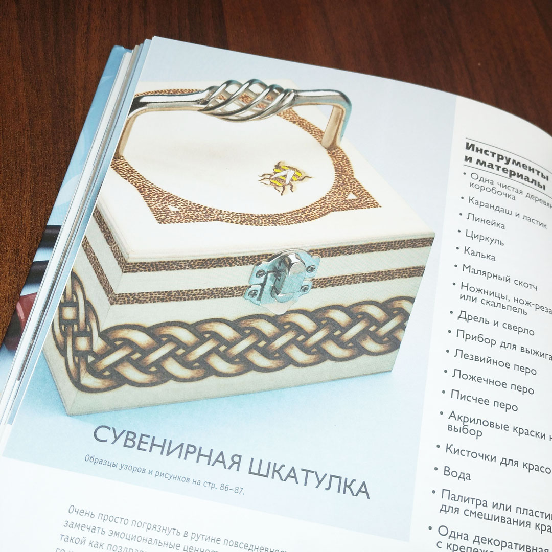 В книге содержатся 14 пошаговых проектов с поясняющими фотографиями по изготовлению красивых подарочных изделий и много рисунков для выжигания.