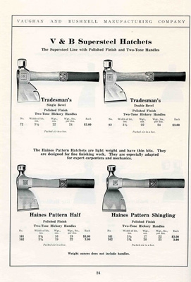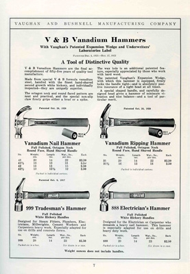 Книга: Каталог инструментов мануфактуры "Vaughan & Bushnell №27". Эта мануфактура выпускала ручные инструменты для более десятка отраслей: для плотников, машинистов, кузнецов, столяров, обойщиков, мясников и т.п. В этом каталоге изданном в 1927 году приведены рисунки, описания, цены на молотки, топоры, ручные рубанки, коловороты, зубила, резцы по камню, гвоздодеры, керны, просечки, кузнечные клещи, цикли, развертки, крюки для бревен, и др. В каталоге также приведены взрыв-схемы рубанков. Начало каждого раздела открывает цветная страница. Язык - английский. Мягкая обложка 60 страниц. Переиздано в 1994 г.