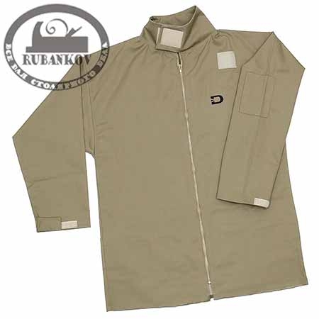 Куртки для токарных работ. Размеры - M, L. Цвет - бежевый. Куртки изготовлены из плотной ткани хлопка смешанного состава. Куртка застегивается на металлическую молнию, рукава и воротник курток надежно застегиваются на липучку. Расстегнутый воротник можно закрепить на куртке. Два кармана находятся со стороны спины, один карман на левом рукаве. На куртки нанесен логотип "D" (dictum).