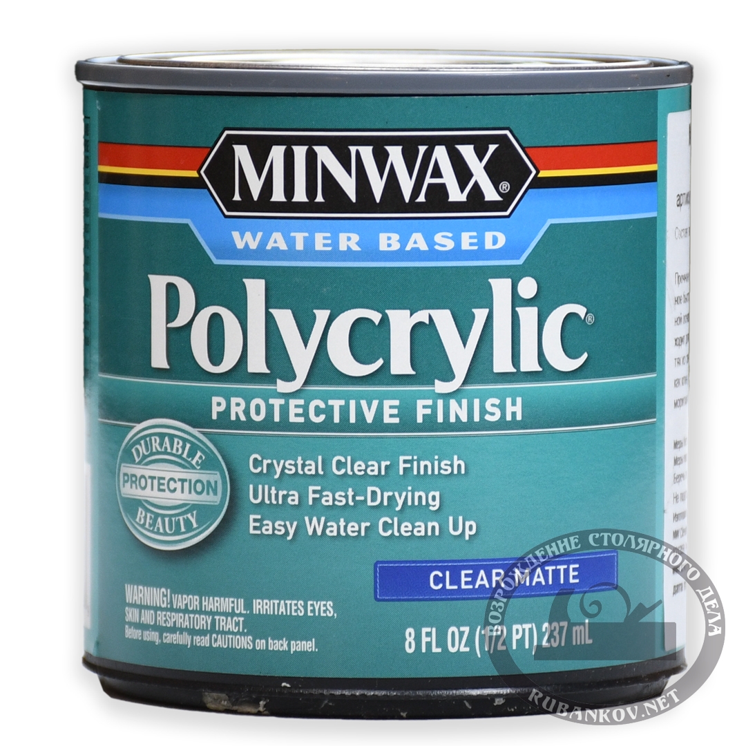 Лак полиуретановый MINWAX POLYCRYLIC, 237мл – прочное финишное защитное прозрачное быстросохнущее покрытие на водной основе для дерева. Идеально подходит для использования на поверхностях из светлой древесины таких пород как клен, ясень и береза, а также поверх морилки Minwax на водной основе. Производство США.