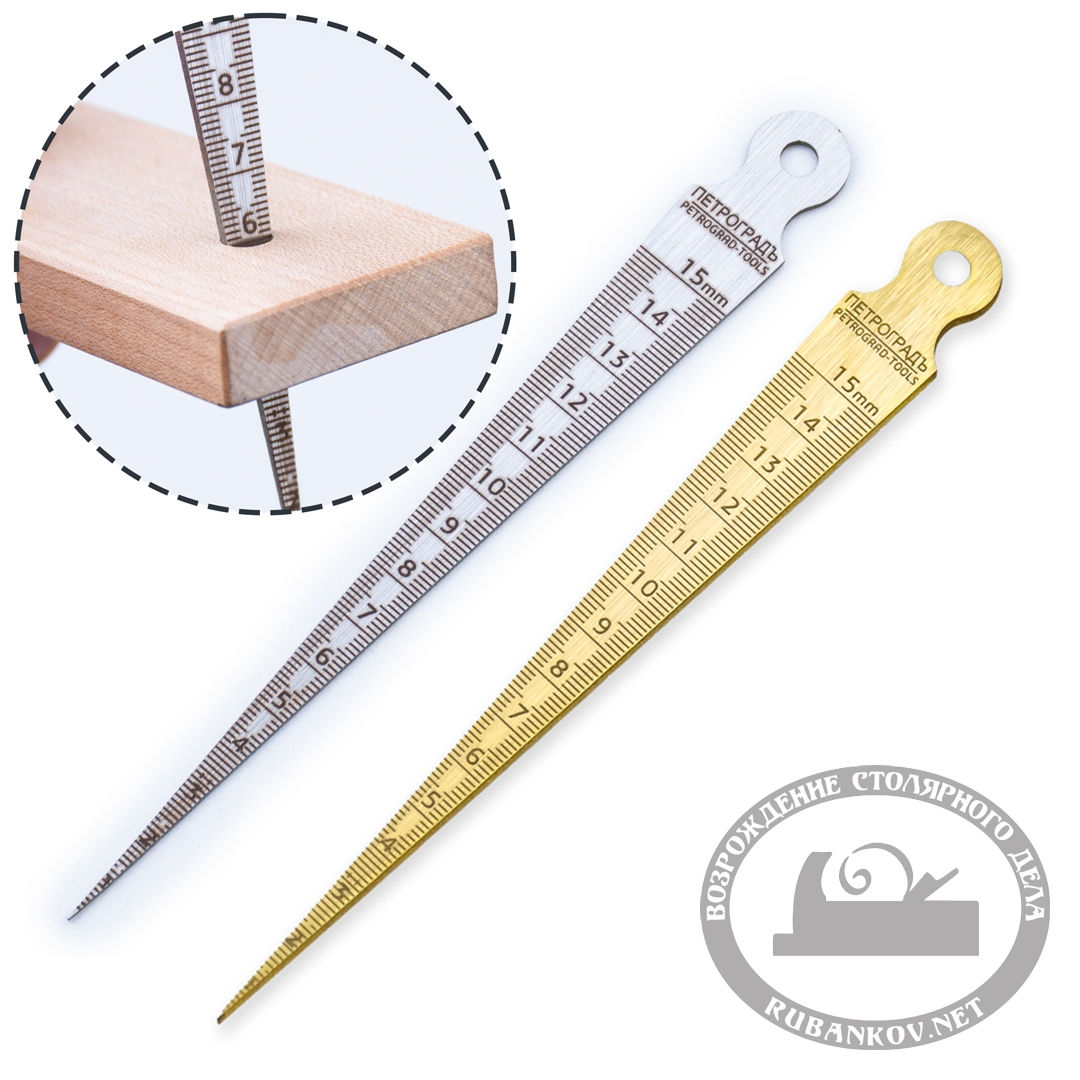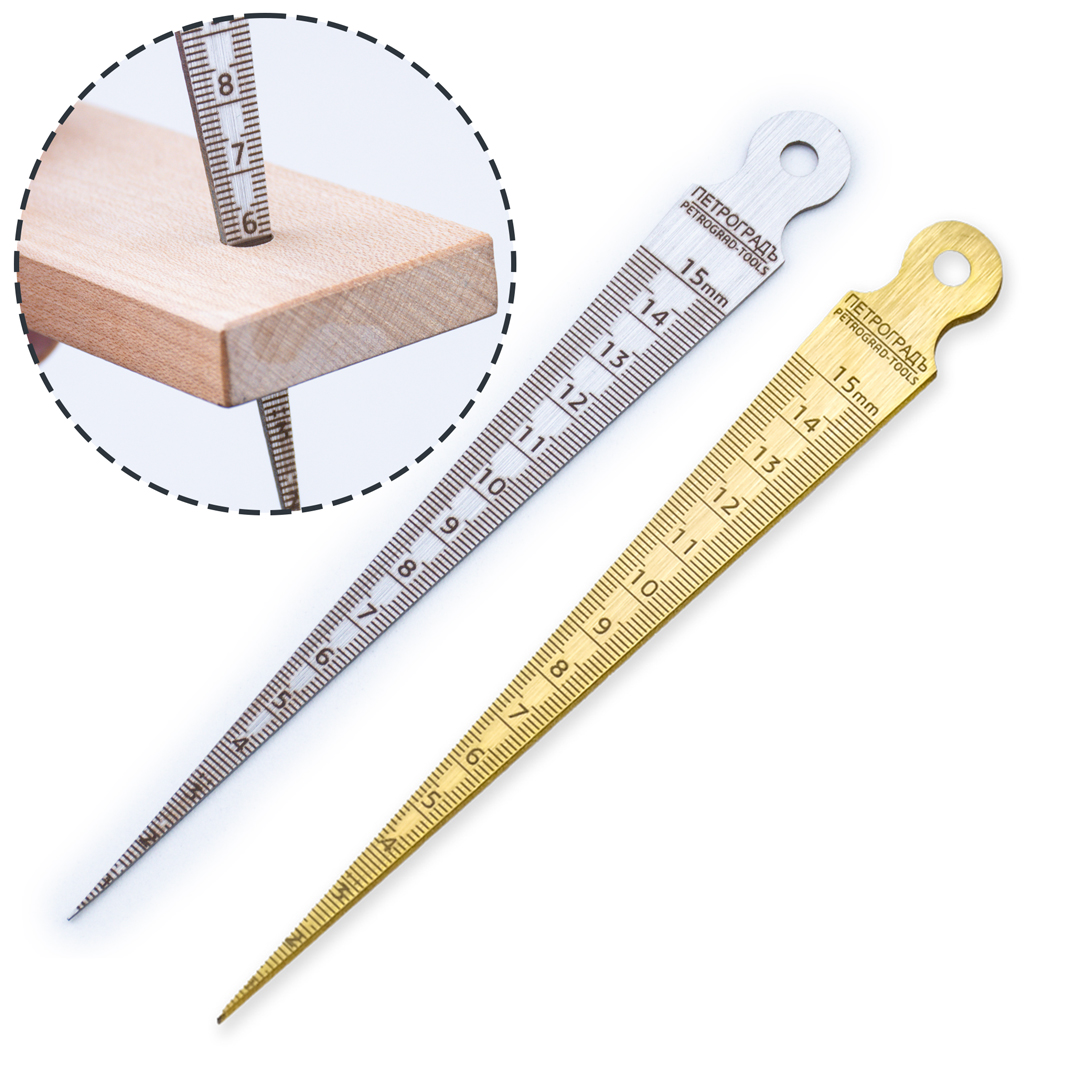 Линейки конусные (щупы клиновые). Щуп предназначен для измерения ширины пазов, шпунтов и зазоров. Также может использоваться для измерения диаметра отверстий. Выпускается в 2-х варианта: латунный и стальной. Производство фабрика Петроградъ (Россия).