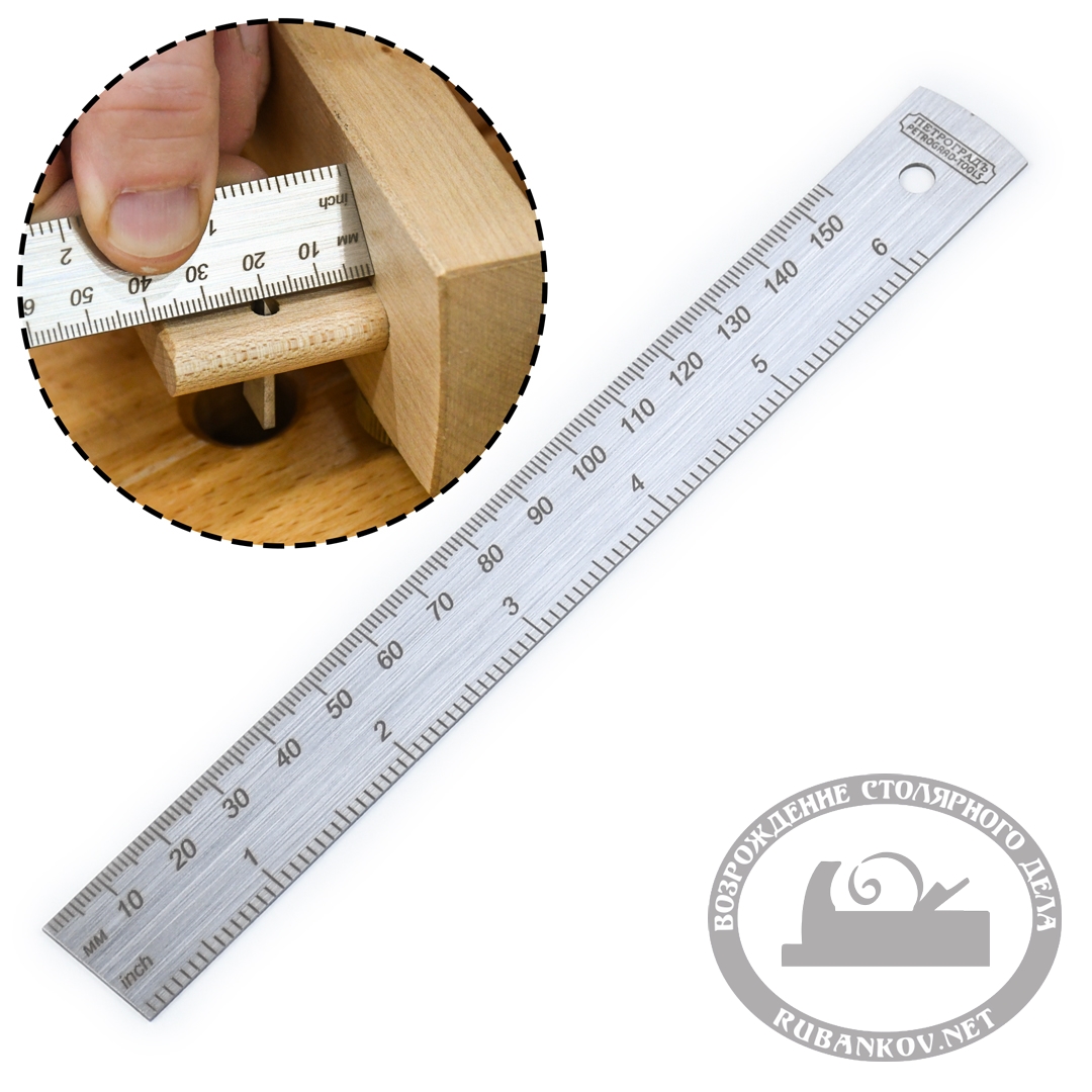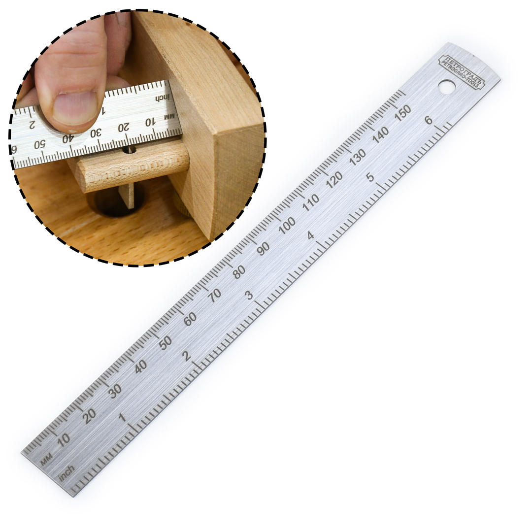 Линейка ПЕТРОГРАДЪ 150мм / 6". Эта компактная линейка жизненно необходима в огромном количестве ситуаций в столярном деле. Например, с ее помощью можно проводить измерения и разметку при создании шиповых соединений. Изготавливается из латуни и нержавеющей стали. Производство – фабрика Петроградъ (Россия).