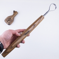 Для этой модели ложкореза разработана удлинённая рукоять специальной формы. Длина рукояти позволяет даёт возможность ложкорезом двумя руками. Восьмигранная в сечении форма рукояти максимально удобна для рук при длительной работе.