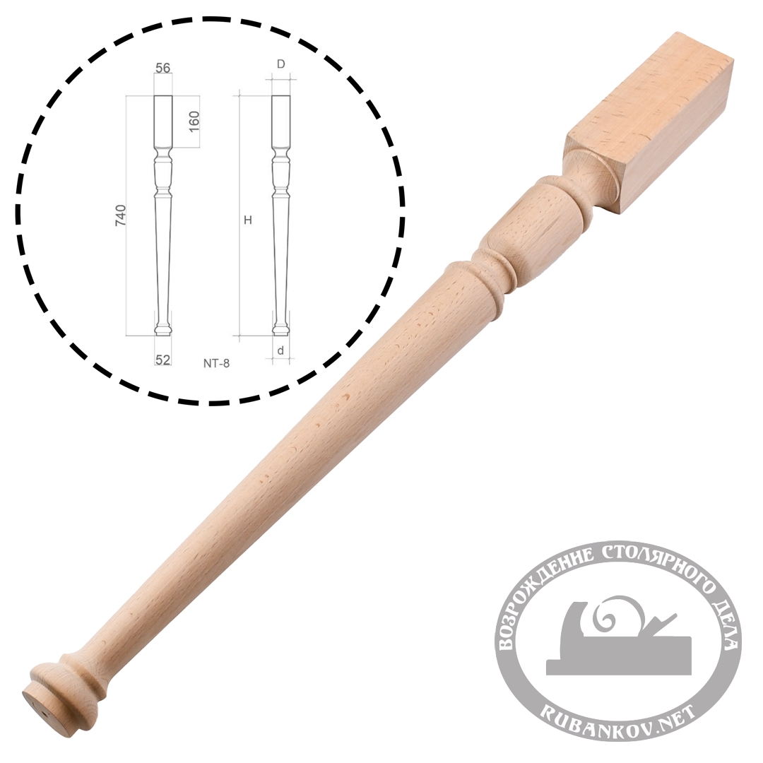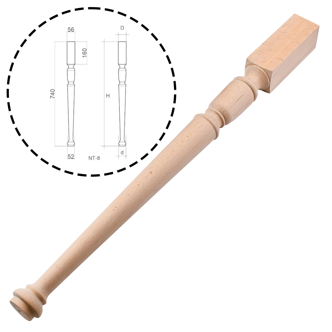 Мебельная опора NT-8, H740, D56, d52 мм, Бук. Это выполненная в традиционном дизайне опора для изготовления мебели из массива. Материал опоры – массив бука. Опора имеет гладкую отшлифованную поверхность. Сделано в России.