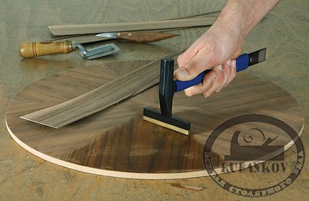 Способ использования молотка для фанеровки: Предварительно нагретым бойком, производят движения вперед-назад по приклеиваемому шпону. Это позволяет вытеснить пузырьки воздуха и избыточный клей. Латунная, специально скругленная и отполированная поверхность на бойке уменьшает трение и эффективно отдает тепло.