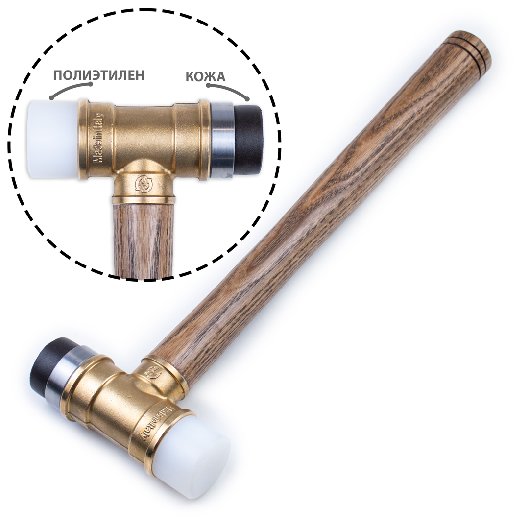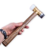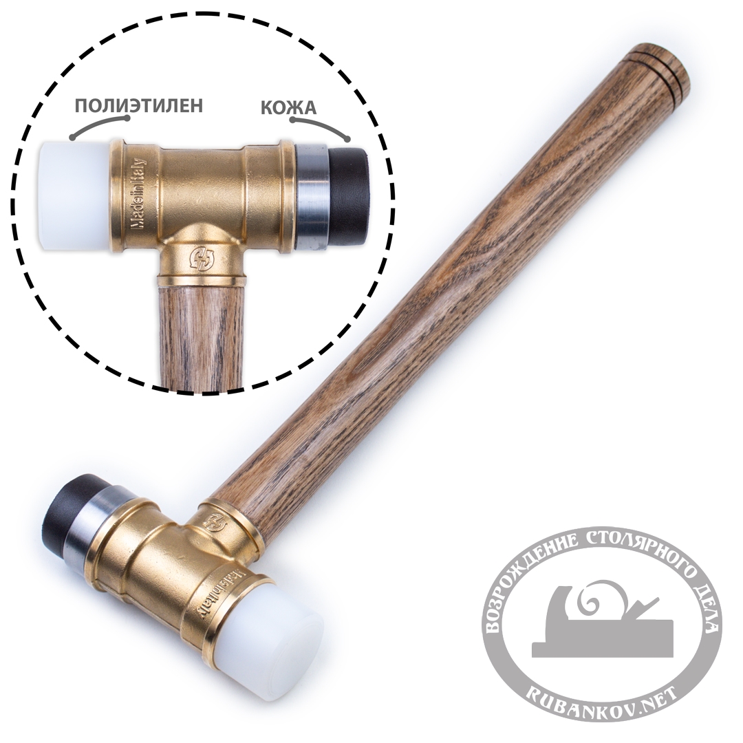 Молоток ПЕТРОГРАДЪ, модель н8 "Стимпанк", рихтовочный со сменными бойками. Предназначен для рихтовочных и сборочных работ. Масса молотка (с двумя установленными бойками) 740 граммов. Размеры молотка 360*120 мм. Диаметр бойка 38 мм. Возможные материалы для бойков: кожа, пластики любой твёрдости, полиуретан любой твёрдости, древесина (бук, ясень). Производство фабрика Петроградъ (Россия).