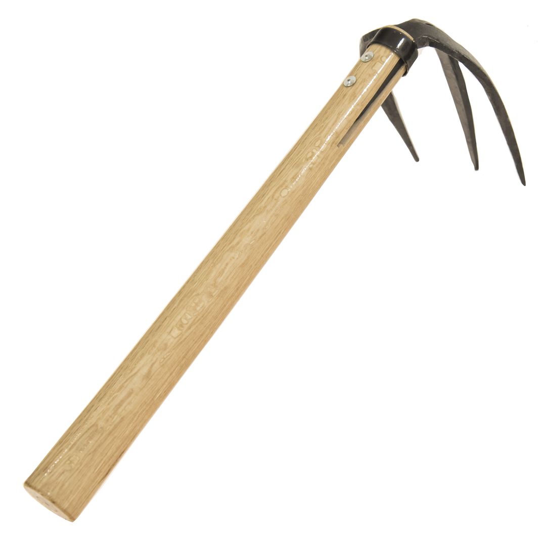 Длинные, сильные тройные зубцы для рыхления почвы и обнажения корней. Ручка из японского белого дуба.