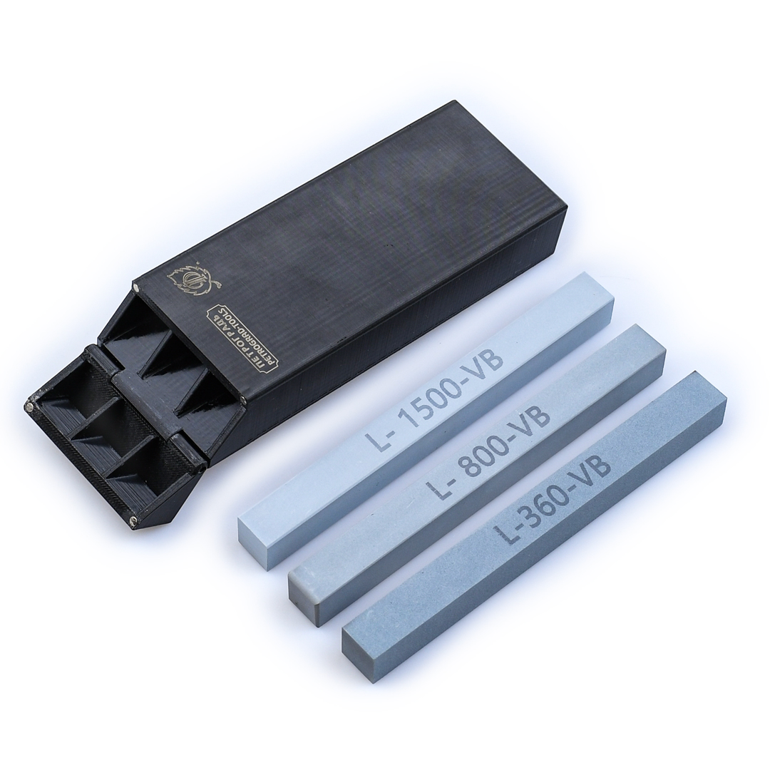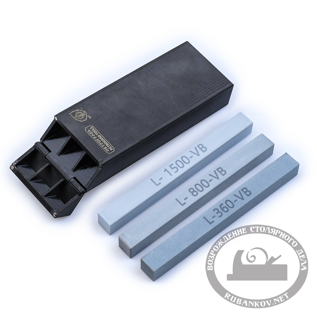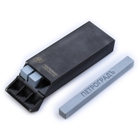 Набор брусков для заточки, 15мм*15ммм*153мм, 3 штуки. Включает в себя 3 наиболее распространенных бруска для заточки бытовых ножей и инструмента для резьбы по дереву. Заточные абразивы помещены в пластиковый футляр с магнитной крышкой. Производство фабрика Петроградъ (Россия).