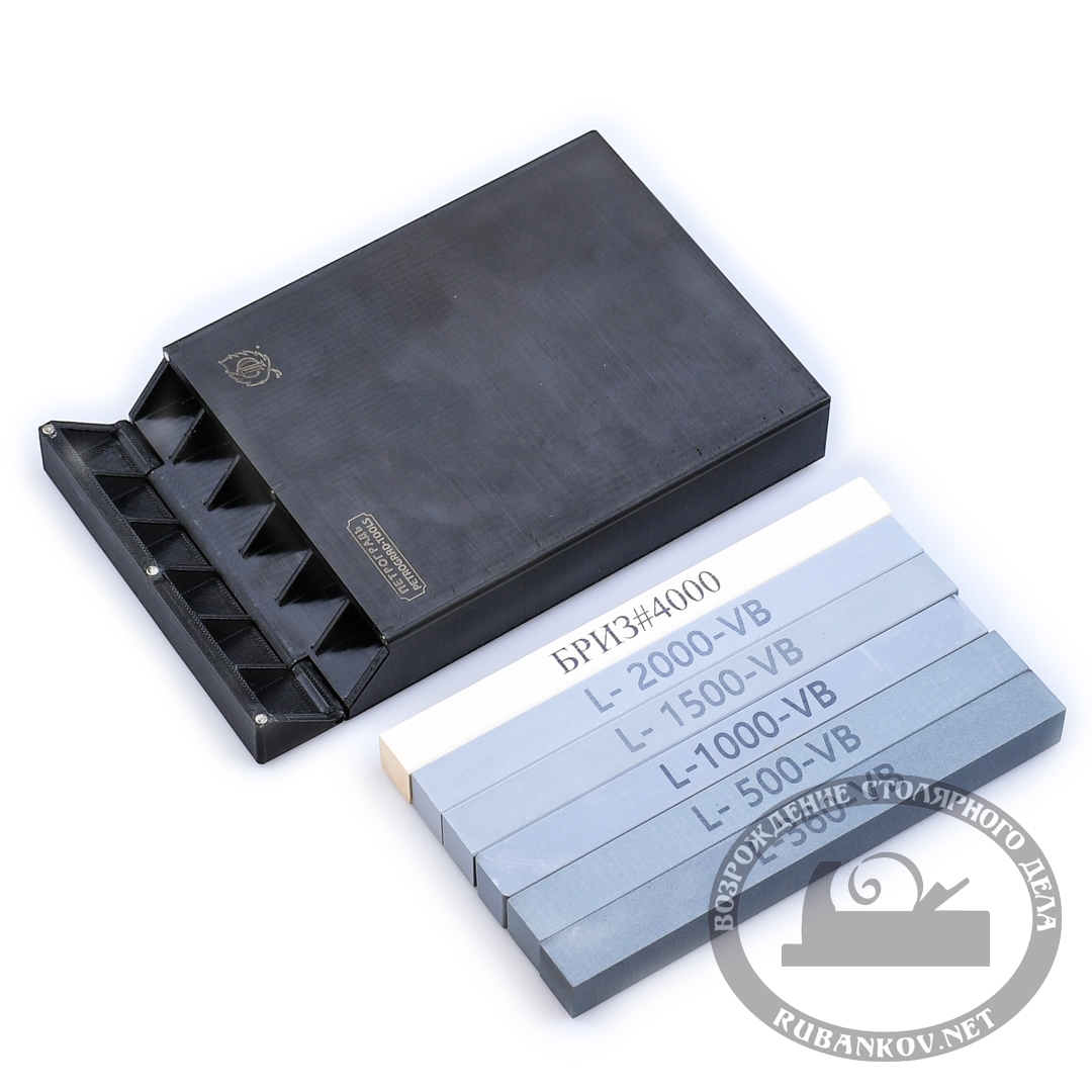Набор брусков для заточки, 15мм*15ммм*153мм, 6 штук. Включает в себя 6 наиболее распространенных бруска для заточки бытовых ножей и инструмента для резьбы по дереву. Заточные абразивы помещены в пластиковый футляр с магнитной крышкой. Производство фабрика Петроградъ (Россия).