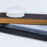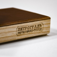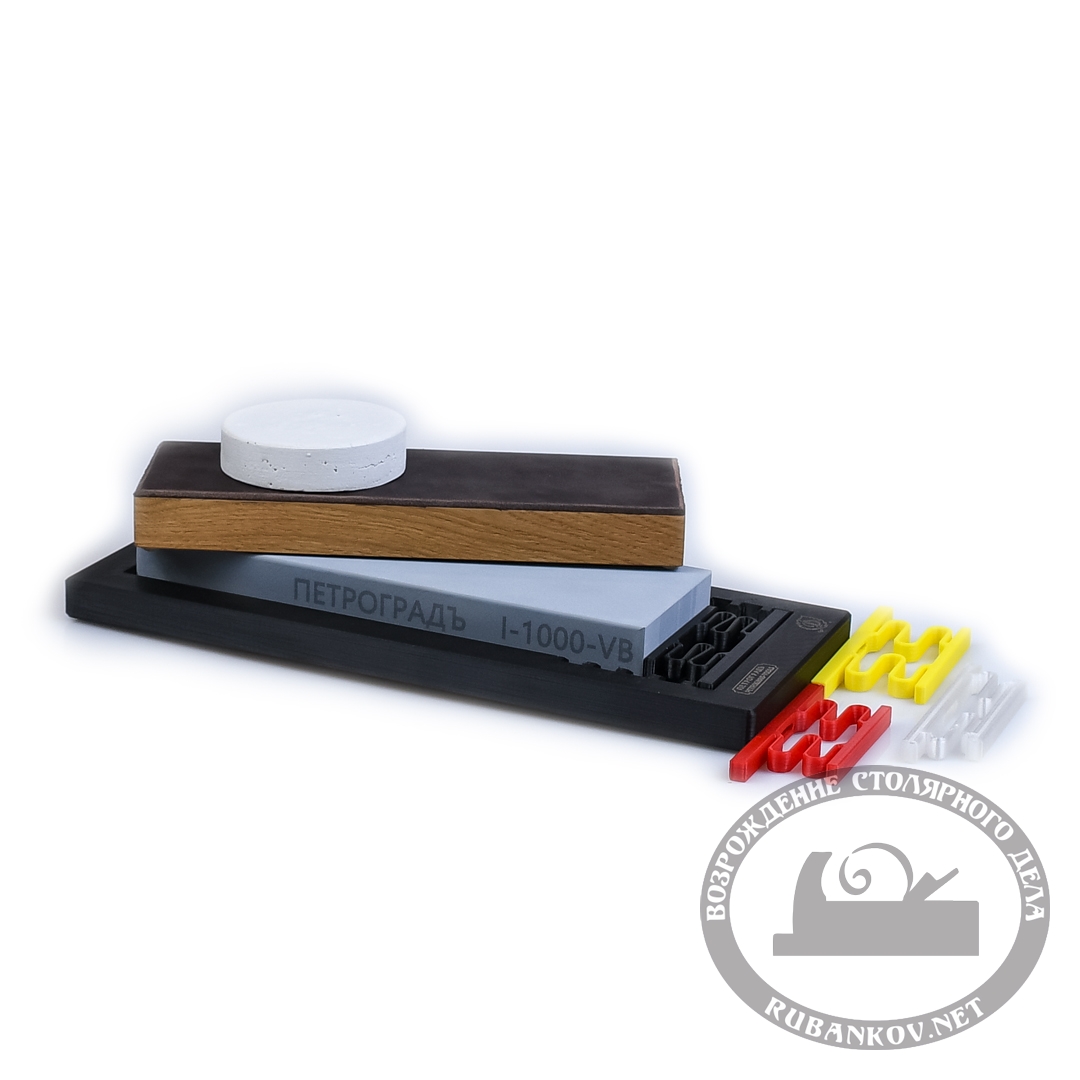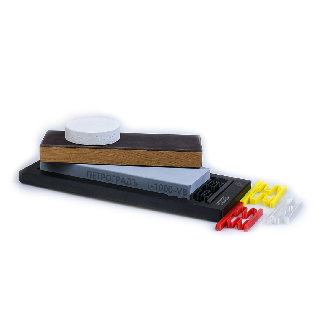 Этот набор включает в себя ручное полировальное устройство с деревянным основанием из массива ясеня, на которое наклеена натуральная кожа. Главной особенностью является возможность использования полировочного бруска как с полировальной пастой, так и без неё, за счет натуральных абразивных свойств кожи. Так же набор включает в себя заточной водный абразив для заточки режущей кромки и держатель абразивов для фиксации заточного камня при заточке.