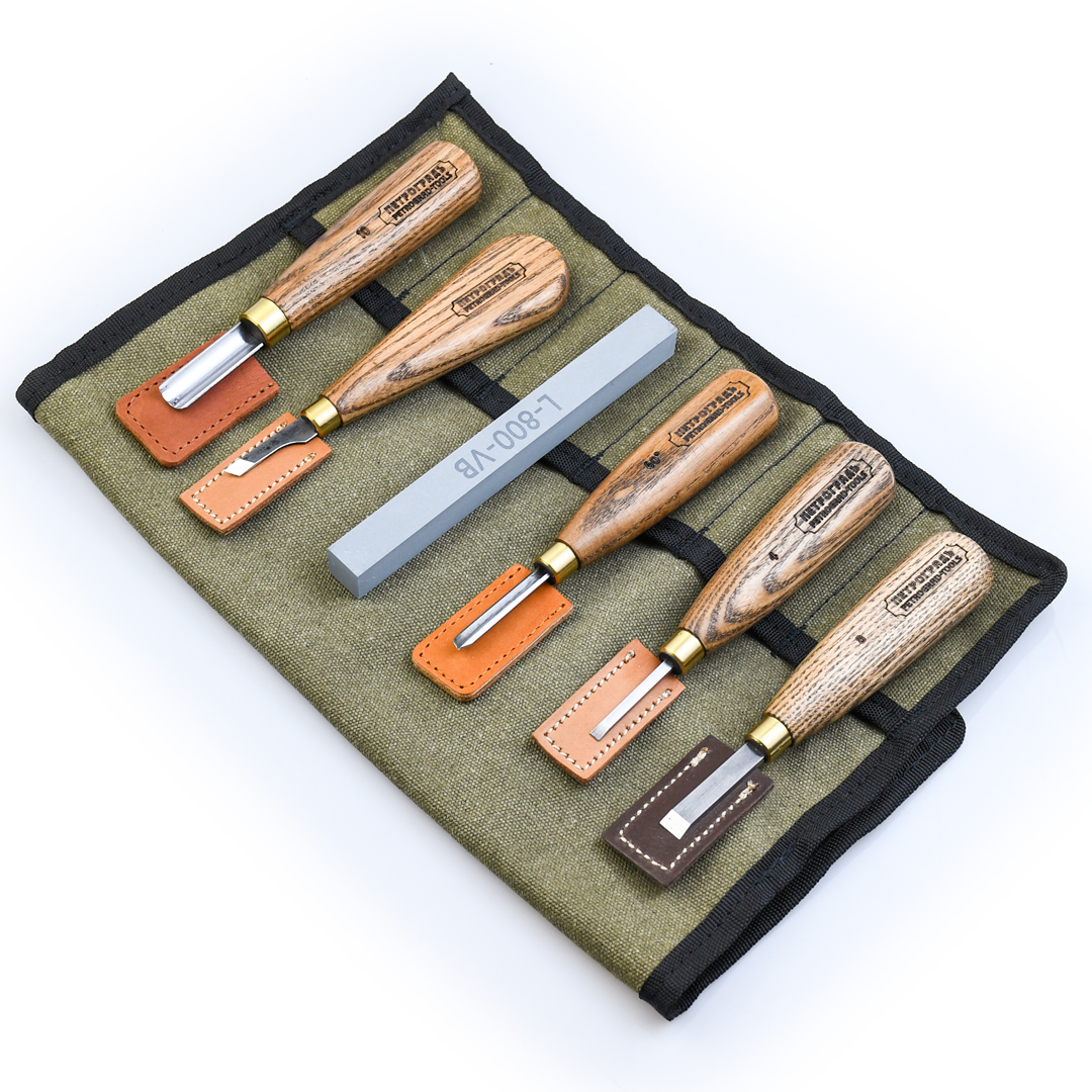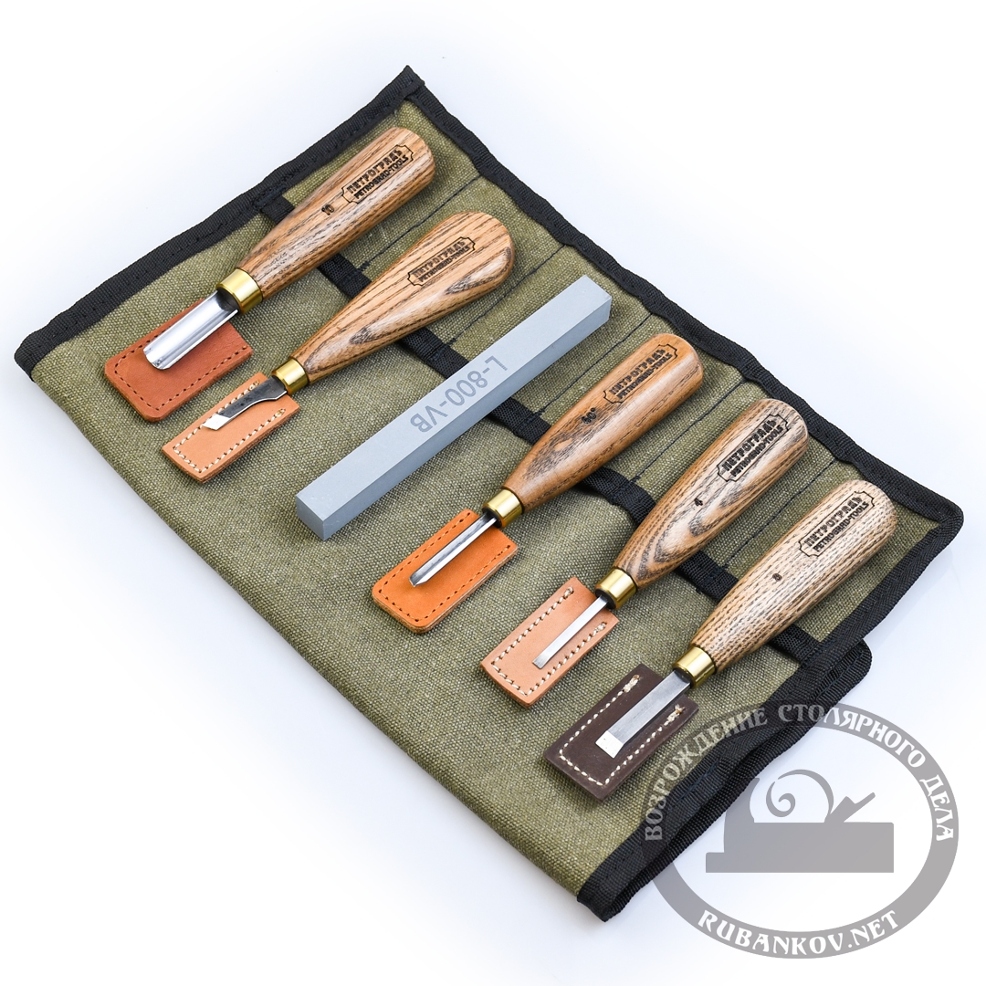 Набор для резьбы по дереву, ПЕТРОГРАДЪ, N3, для плоско-выемчатой резьбы, 6 предметов, в скрутке. Включает в себя 5 разнообразных резцов, а также заточной абразив и сумку-скрутку. Производство фабрика Петроградъ (Россия).