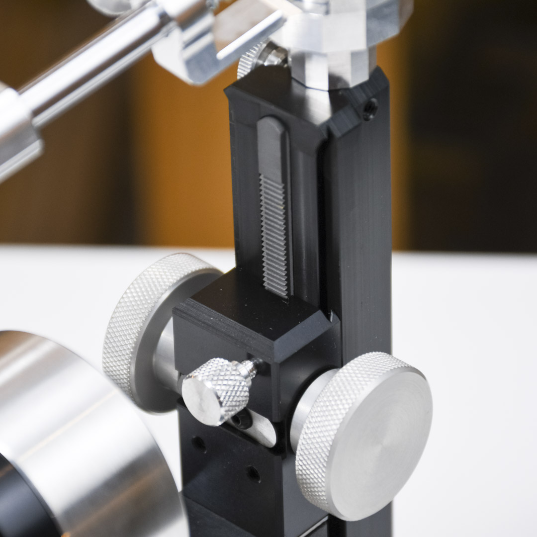 Крепление ползуна происходит через соединение типа ласточкин хвост, что исключает люфты механизма при работе, которые могли бы сказаться на качестве заточки. За работу подъемного механизма отвечает стальная рейка. Шкала измерения углов нанесена на лицевую сторону ползуна и дает возможность визуально контролировать их установку.