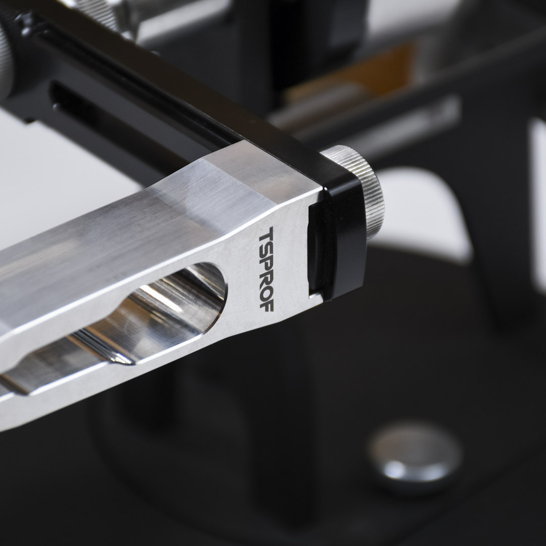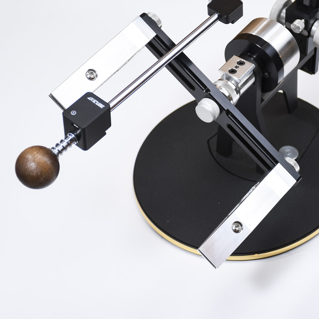 В комплекте с держателем абразива имеется устройство для измерения угла заточки – Axicube. Разработанный специально для систем заточки угломер встроен в корпус подвижного упора держателя и позволяет отслеживать параметры угла заточки в реальном времени. Axicube имеет жесткую связь с держателем абразива и находится в плоскости абразивного камня. Это позволяет получить максимальную точность угла в процессе работы. Позволяет выставлять угол с точностью до 0,1°. Axicube имеет алюминиевый корпус с черным анодированием, обладает влаго- и пылестойкостью, устойчив к вибрациям, падениям и перепадам температур. Может эксплуатироваться при температурах от 0 до +40°С. Заряжается от стандартной зарядки micro-USB. Каждый Axicube проходит калибровку на производстве с помощью поверенных средств измерения. Перед применением с помощью специальной калибровочной призмы ему задается начальный угол отсчета. При перестановке заточного устройства на другую поверхность, необходима новая калибровка с помощью призмы. Axicube является запатентованным изобретением. Патент №2768504. Axicube® является зарегистрированным товарным знаком. Устройство не предназначено для других измерений помимо заточки, корректная работа устройства возможна только в комплекте с Профиль К03 Pro. Изделие не совместимо с заточными устройствами TSPROF Kadet и TSPROF Blitz. Корректная работа устройства с другими заточными системами не гарантирована.