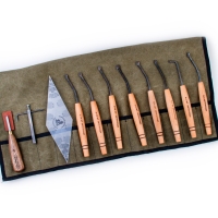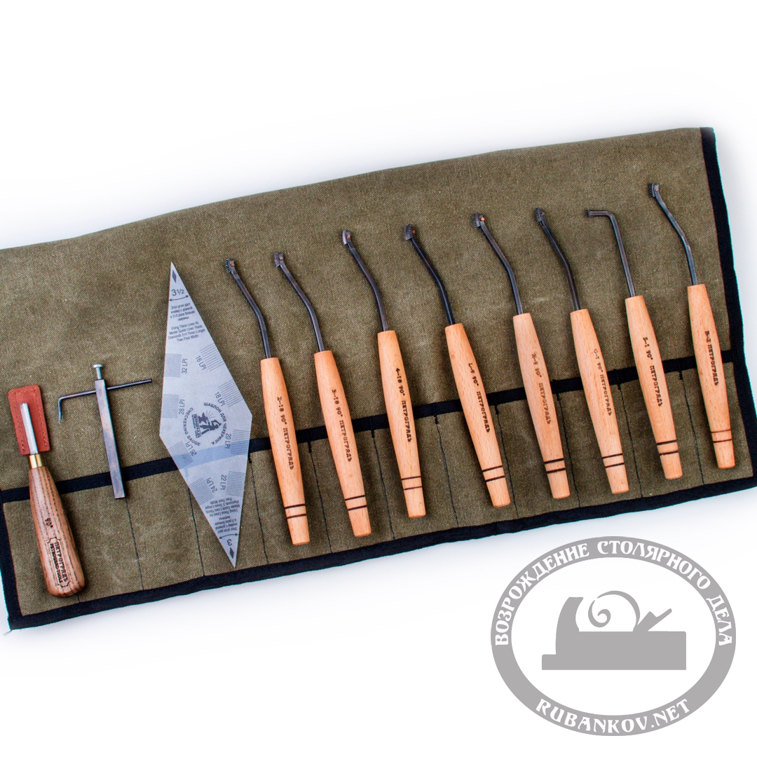Набор инструментов для чекеринга, N3, 90°/18линий, 10 предметов. Резцы для чекеринга ПЕТРОГРАДЪ. Чекеринг - вид резьбы по дереву и украшения рукоятей, прикладов и оружейных лож. Инструменты для чекеринга под маркой Петроградъ представляет российская компания RUBANKOV. Резцы для чекеринга нашей марки выполнены на основе опыта, полученного при эксплуатации резов известных мировых производителей. Модельный ряд содержит все основные резцы размером от 16 до 32 линий на дюйм с углами заточки 60° и 90°. Ко всем резцам можно докупить запасные режущие насадки и шаблон. Резцы для чекеринга закалены до твердости 59HRC.