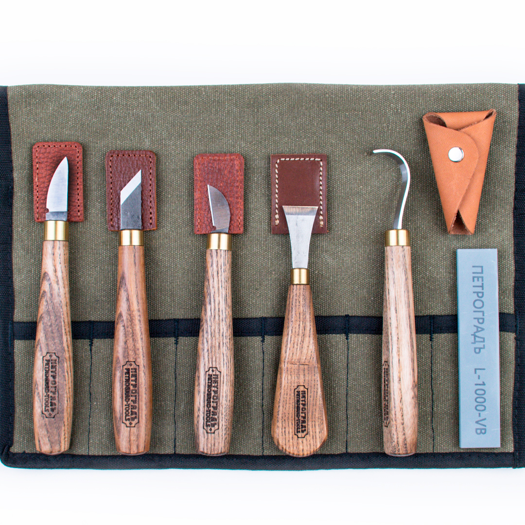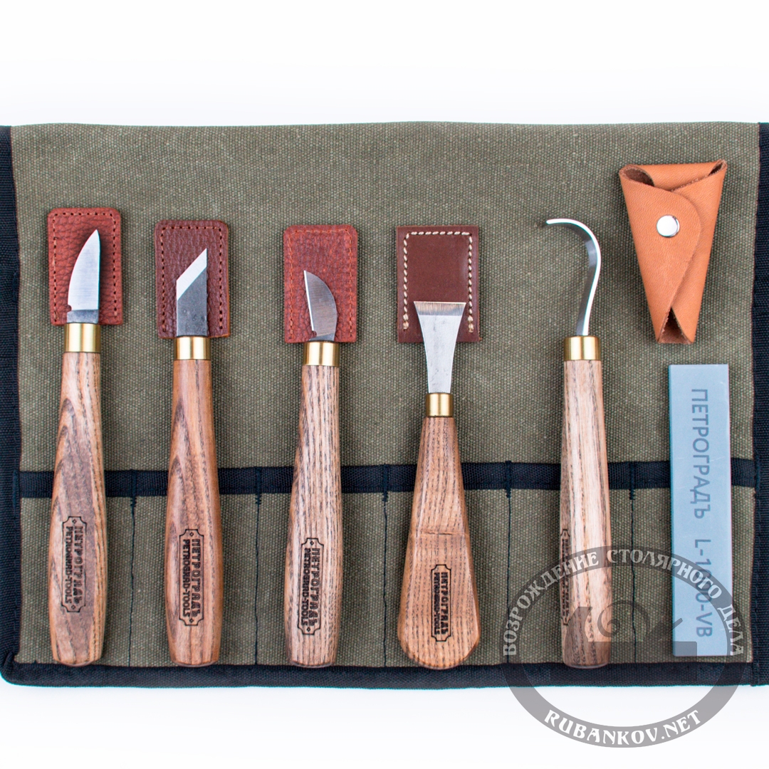 Набор инструментов для резьбы по дереву н3/26, для художественной резьбы. Набор сформирован из инструментов для резьбы по дереву, подойдет для фигурной художественной резьбы, а так же для вырезания ложек. Включает в себя 5 разнообразных резцов, заточной абразив и сумку-скрутку. Производство фабрика Петроградъ (Россия).