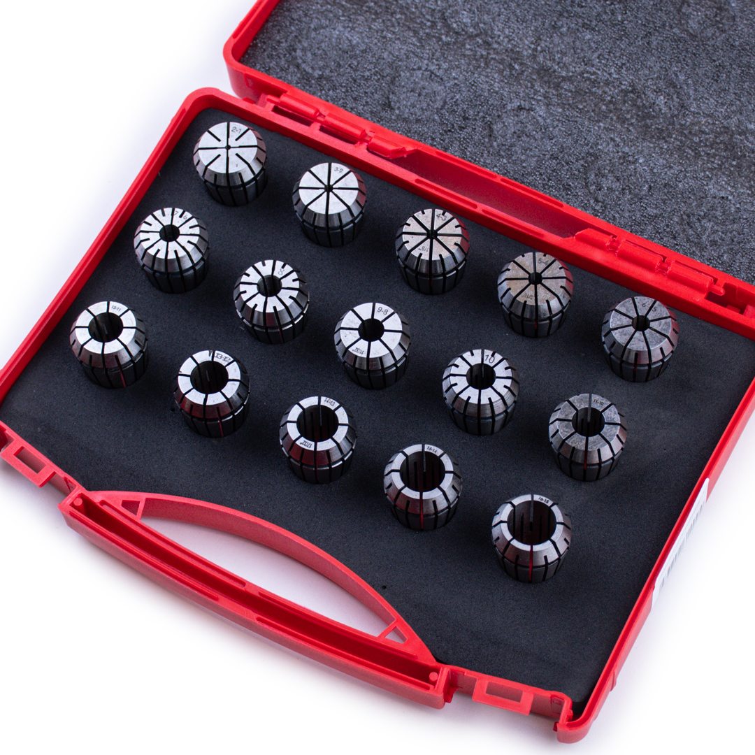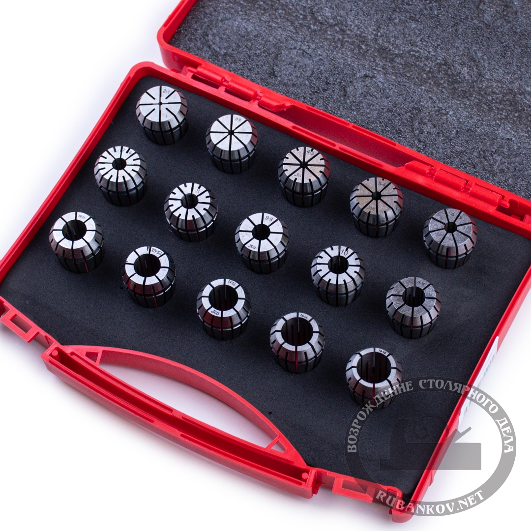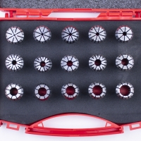 Набор из 15 цанг ER25 (1-16мм), в пластиковом кейсе. Предназначены для установки в цанговый патрон. Цанги выполнены из инструментальной стали. Набор поставляется в пластиковом кейсе. Размеры цанг: 2-1; 3-2; 4-3; 5-4; 6-5; 7-6; 8; 9-8; 10; 11-10; 12-11; 13-12; 14-13; 15-14; 16-15. Производство – GOLDRATIO (Индия).