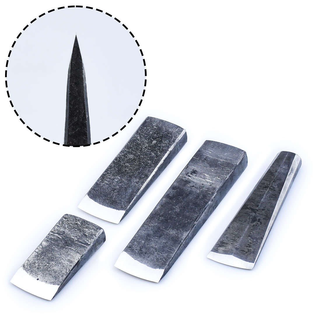 Набор состоит из 4-х клиньев с разными углами клина, длины и формы. Более пологие клинья подойдут для твердых и сложных пород. Набор клиньев позволит расколоть практически любое бревно.