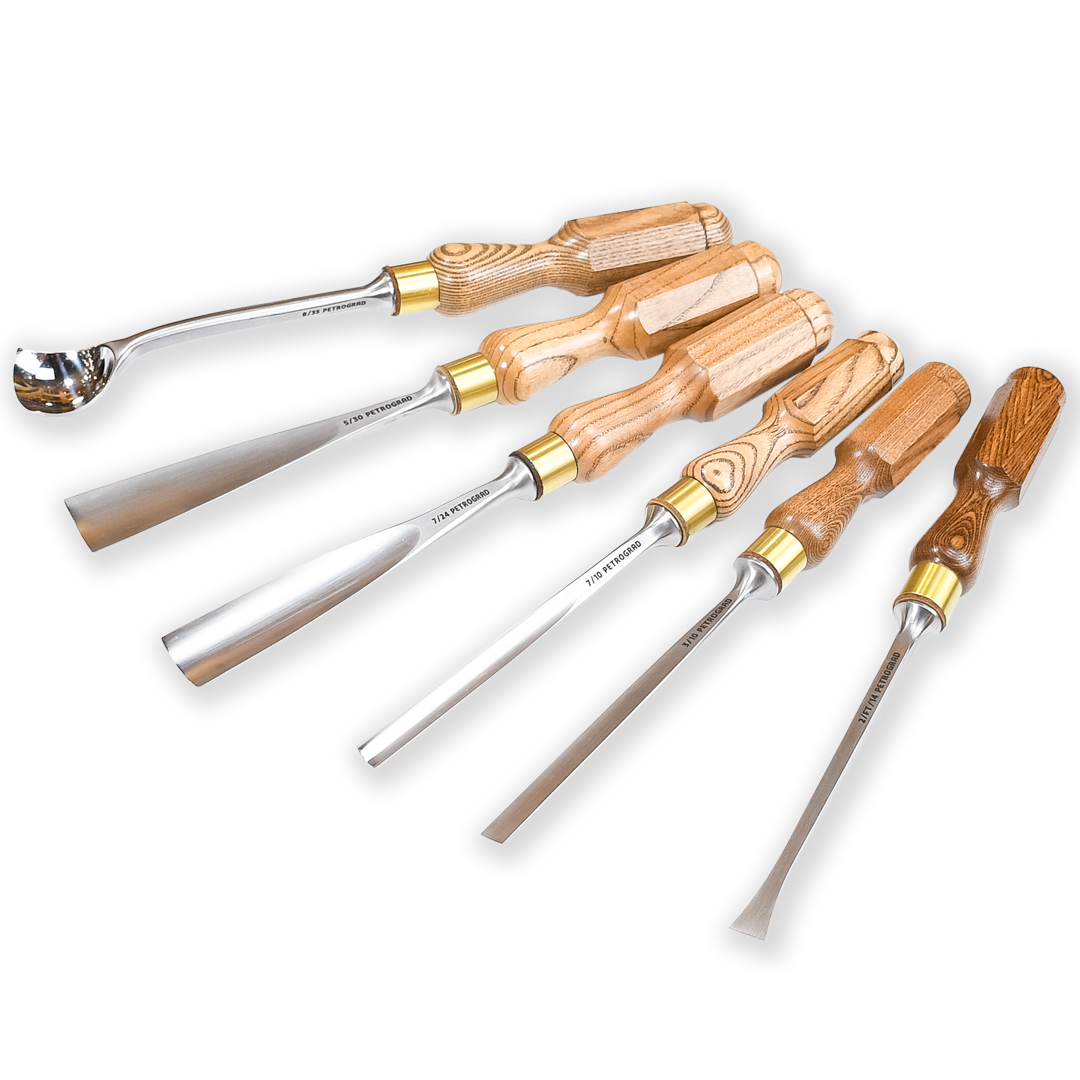 Набор стамесок ПЕТРОГРАДЪ, из книги Ф.Дмитриева и А.Уланова "Новгородский стиль...", 13 штук Резчицкий инструмент профессионального уровня предназначен для резьбы по твердым и мягким породам древесины. Набор - основа любого комплекта резчицкого инструмента. Прямые крутые и отлогие стамески, полуклюкарзы, эйсмусы (уголки) для множества задач от создания фигурных форм до подбора фона. Набор разработан и подобран как для профессионалов, так и для начинающих резчиков по дереву.