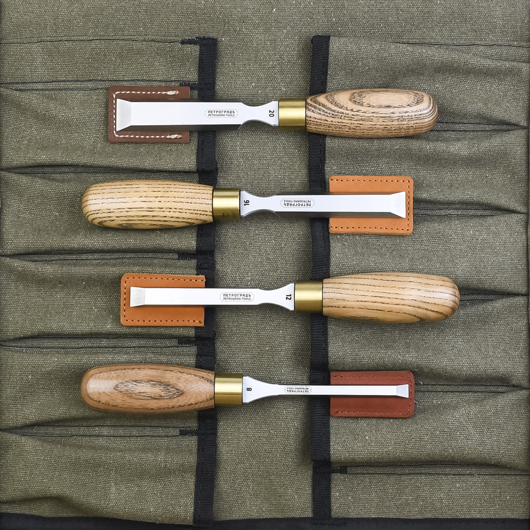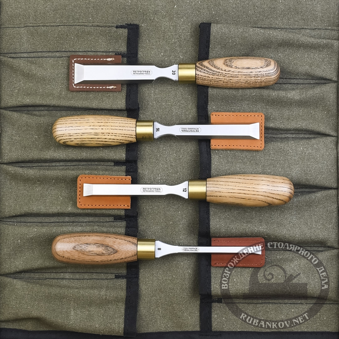 Набор стамесок ПЕТРОГРАДЪ, серия Нева, 4 штуки (8, 12, 16, 20), в сумке-скрутке. Стамески спроектированы, ориентируясь на многолетний опыт мастеров-краснодеревщиков. Форма лезвия имеет боковые скосы для работы в труднодоступных местах, например при подрезке и подчитки шиповых соединений: ласточкин хвост, шип-проушина, впол дерева, сковородней и прочие. Производство фабрика Петроградъ (Россия)