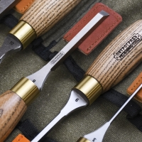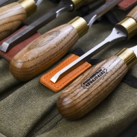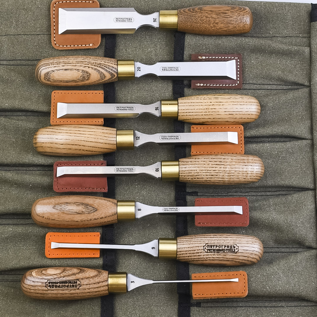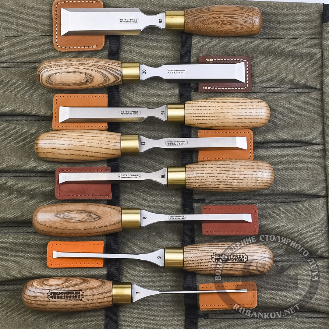 Набор стамесок ПЕТРОГРАДЪ, серия Нева, 8 штук (3, 6, 8, 10, 12, 16, 20 и 26мм), в сумке-скрутке. Стамески спроектированы, ориентируясь на многолетний опыт мастеров-краснодеревщиков. Форма лезвия имеет боковые скосы для работы в труднодоступных местах, например при подрезке и подчитки шиповых соединений: ласточкин хвост, шип-проушина, впол дерева, сковородней и прочие. Производство фабрика Петроградъ (Россия)