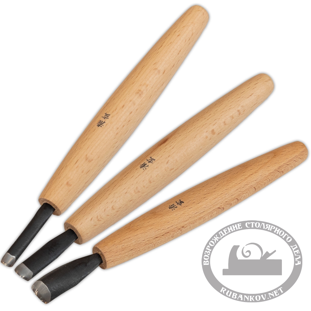 Набор профессиональных японских стамесок для резьбы по дереву. Резцы предназначены для резьбы средних деталей и деталировки при плоскорельефной резьбе и барильефной резьбе по дереву. Выполнены из кованной двухслойной стали - основа вязкий метал, а режущая часть - твёрдая сталь синяя бумага 2 (Aogami #2, blue paper steel). Производство Seigen (Япония)
