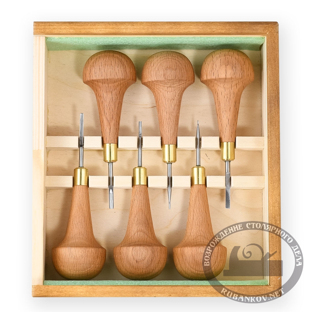 Инструмент для резьбы выполнен из стали Р6М5. Рукояти изготавливаются из различных благородных пород древесины, например, бук, груша и др. Поставляются фанерной в коробке. Все резцы заточены и готовы к работе.