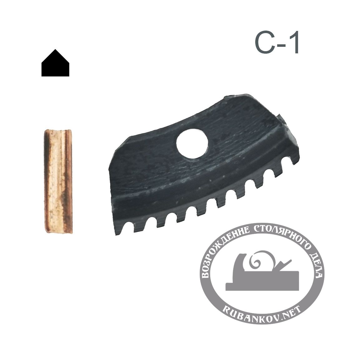 Резецы типа С имеет 1 пирамидальный зуб. Уголы вершин 90 и 60 градусов. Все резцы изготовлены из стали, прошли процесс закалки и обработки. Имеют V-образную форму. Резецы С-1 предназначен для нанесения оригинального макета рисунка, а также для углубления канавок после их нанесения, другими резцами. Высокая рельефность обеспечивает быструю и ровную нарезку на твердых породах древесины. Резцы могут резать, как глубокие так и мелкие пазы, прямые или закругленные углы, параллельные линии или перекрестную штриховку, по направлению волокна или поперек. Не нужно заново делать проход, чтобы обработать неровные участки. При определенных навыках ровной получается каждая канавка. Резцы для чекеринга закалены до твердости 59HRC.