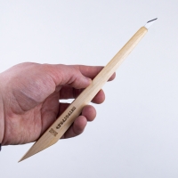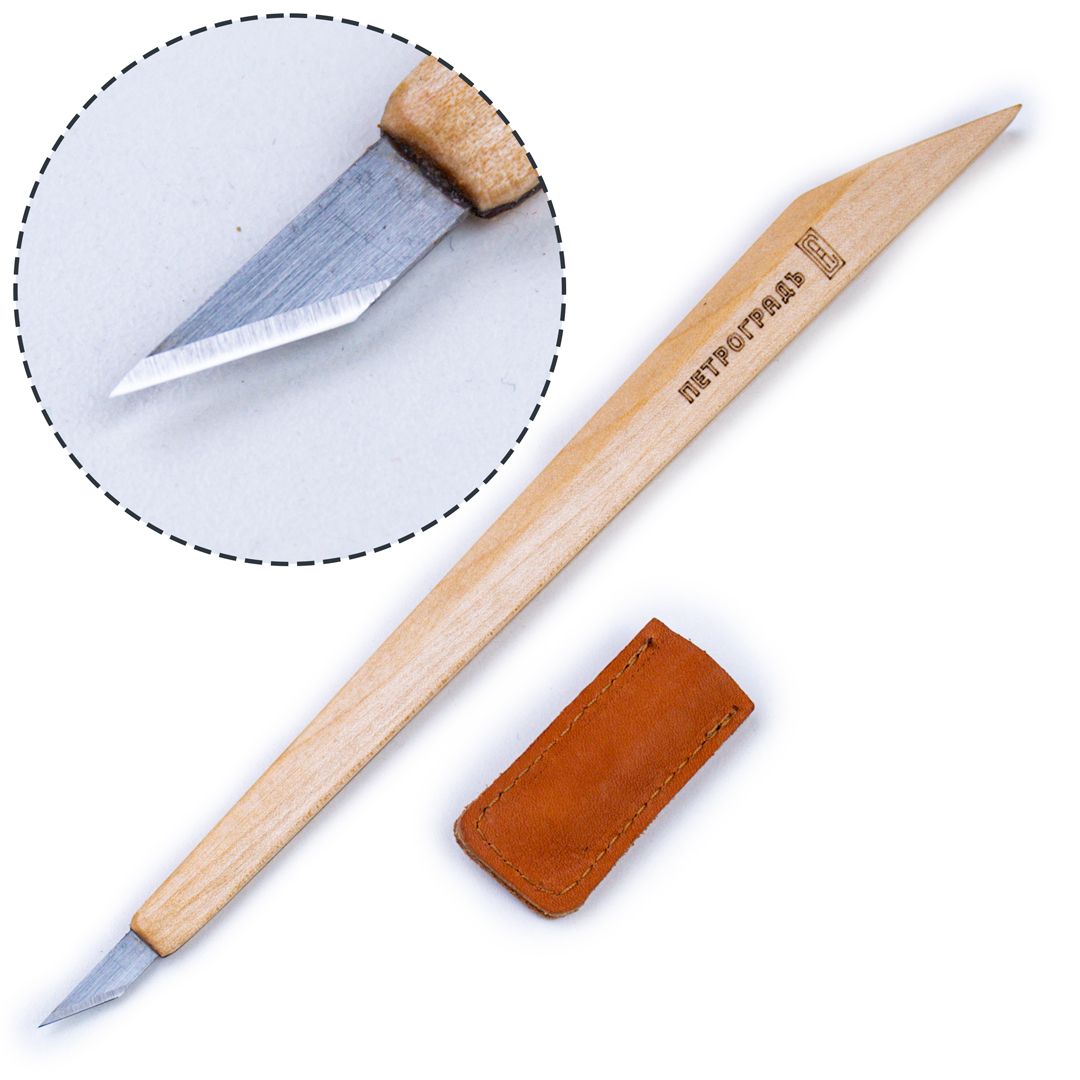 Нож для маркетри ПЕТРОГРАДЪ. Предназначен для изготовления элементов деревянной мозаики из шпона. Толщина клинка – 1 мм, ширина - 6мм, заточка двусторонняя, угол скоса клинка - 25 градусов. Материал рукояти – клён. Производство – фабрика Петроградъ (Россия).