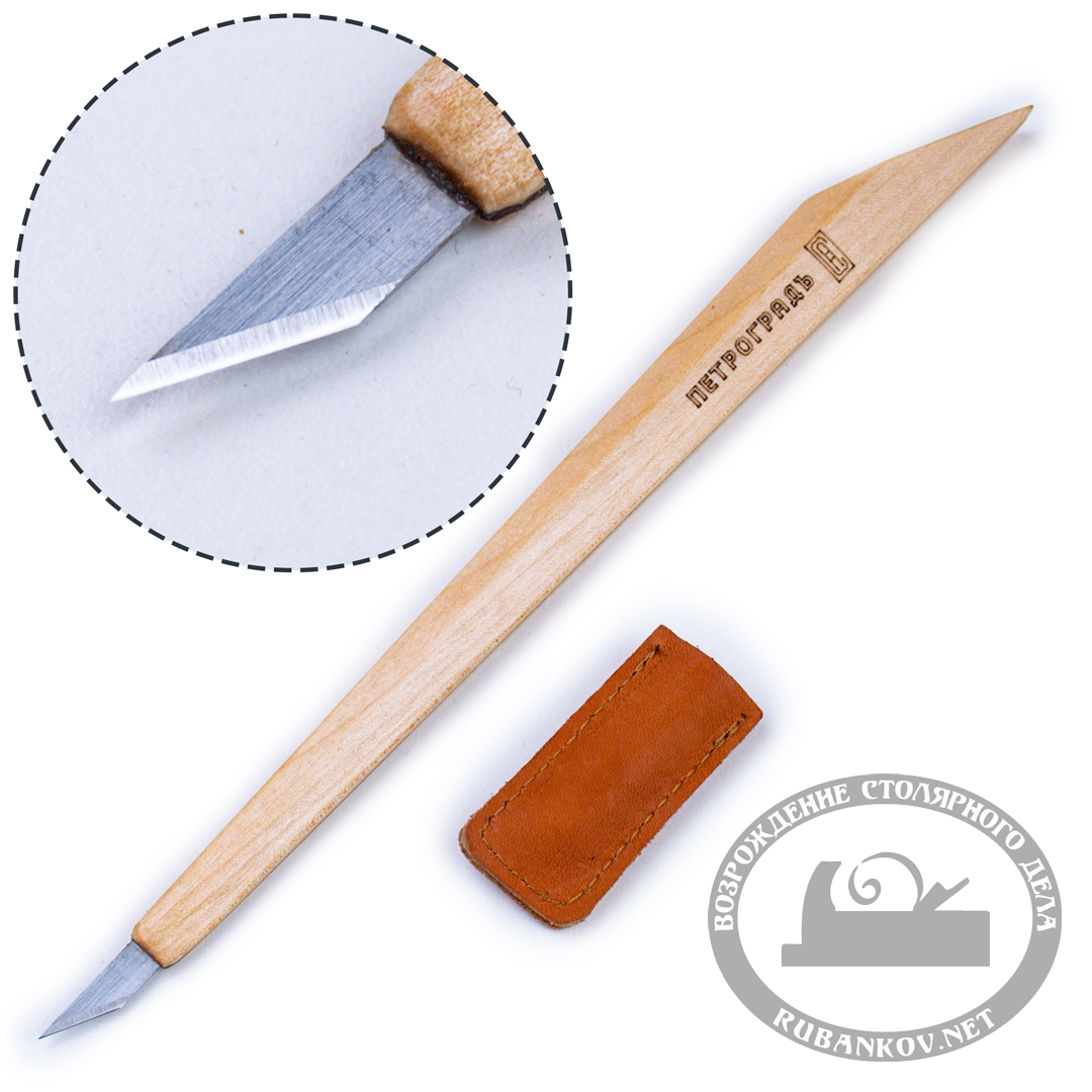 Нож для маркетри, сделанный на фабрике ПЕТРОГРАДЪ, выполнен с учётом рекомендаций, данных такими мастерами Фёдор Алексеевич Бондарев (Обучающая Мастерская Дельница, Москва) и Анатолий Анатольевич Грень (Санкт-Петербург).