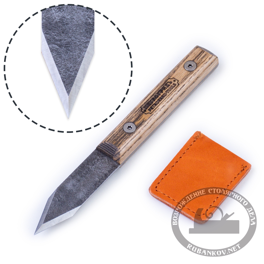 Клинок выполнен в виде стрелы с односторонней заточкой для удобства работы справа и слева от направляющей линейки. Материал клинка - сталь 9ХФ, твёрдость - 59-61 HRC. Накладки выполнены из ясеня, покрыты специальным тонированным маслом. Нож упакован в картонную коробку.