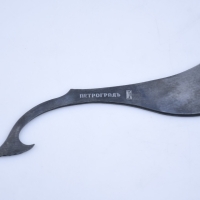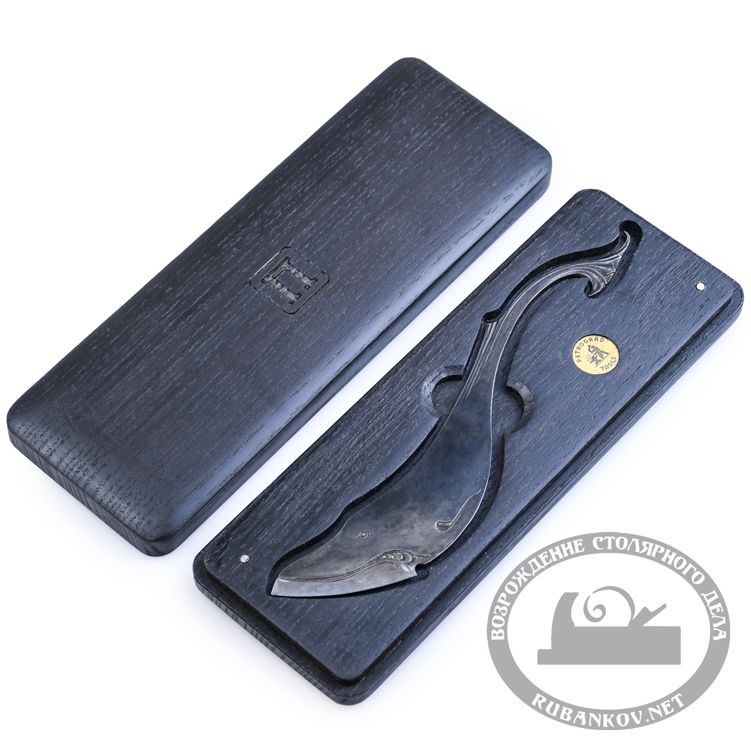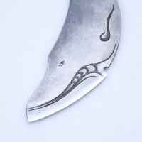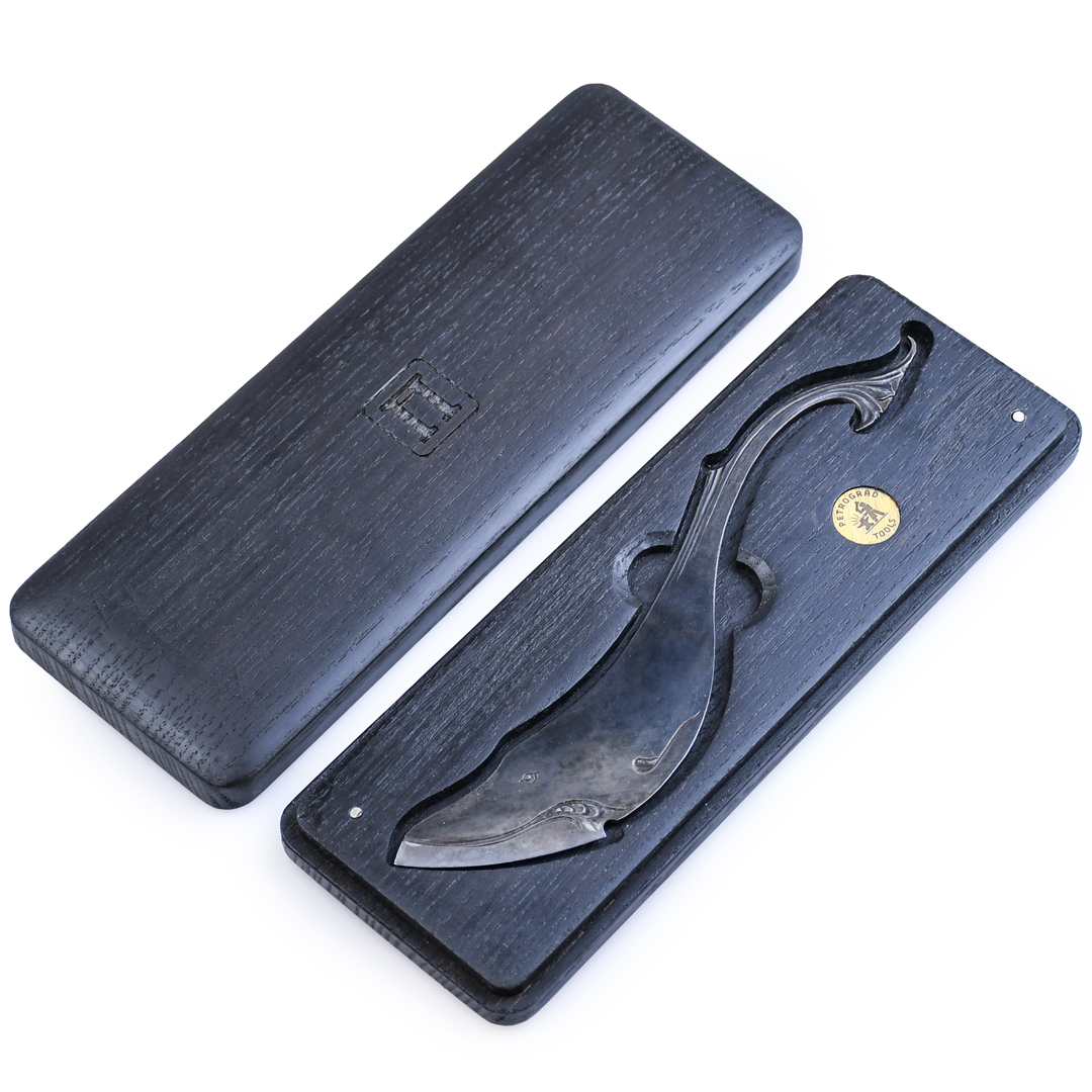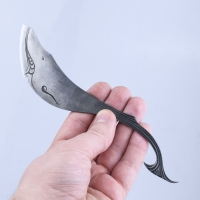 Нож ремесленный ПЕТРОГРАДЪ, Кит авторская работа мастера Александра Савина, инструмент ручной работы, предназначенный для обработки кожи и разметки деревянных заготовок. Форма ножа имеет силуэт кита, инструмент дополнен гравировкой, выполненной методом аброна. Технологический процесс включает закалку, чернение и тонкую шлифовку поверхности. Нож имеет одностороннюю заточку.
