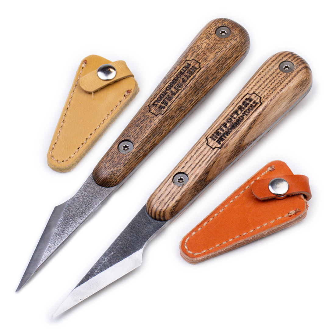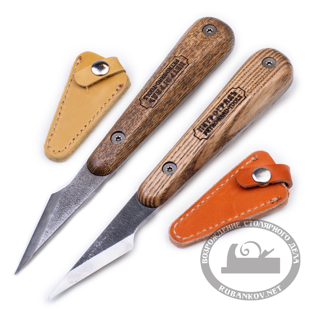 Ножи-косяки разного размера с углом скоса 20 градусов. Нож косяк - один из наиболее универсальных резчицких инструментов, применяется при разметке, грубом съеме материала, при роспуске шпона и выполнении резчицких элементов декора. Комплектуется кожаным чехлом. Производство фабрика Петроградъ (Россия).