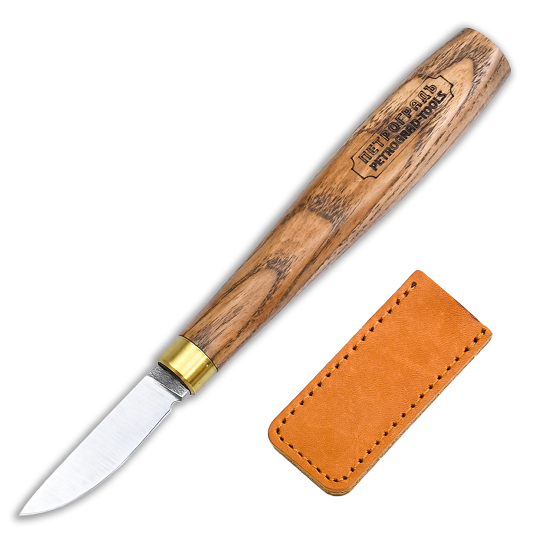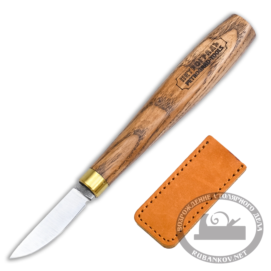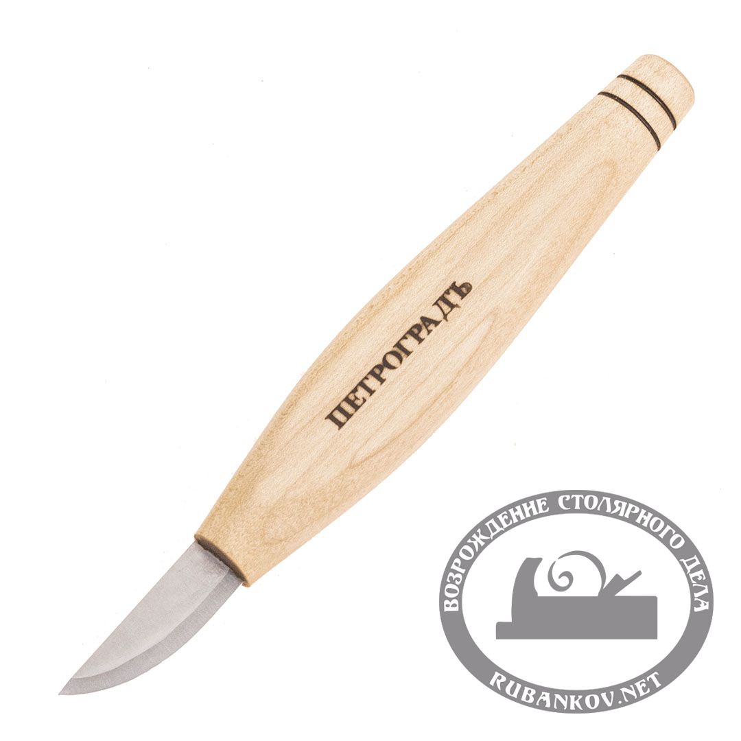 Ножи для резьбы по дереву ПЕТРОГРАДЪ, шведский тип. Ножи с прямым обухом и изогнутой режущей кромкой отлично подходит как для съёма лишнего материала, так и для финишной работы при резьбе по дереву. Особенностью этой модели является спуск клинка от обуха. Отличный нож как для начинающих, так и для профессионалов. Удобная рукоять из твердых пород древесины. Рукоять покрыта маслом для защиты древесины. Место всада клинка укреплено латунным кольцом и закрыто кожаной вставкой. Аналог ножа для резьбы по дереву "Sloyd Knife". Все ножи заточены и готовы к работе. Производство фабрика Петроградъ (Россия).