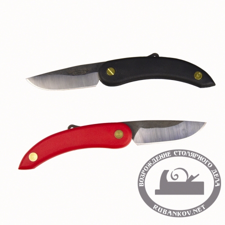 Нож складной походный, Svord Peasant Knife. Общая длина ножа - 215мм, длина клинка - 85мм, толщина - 2мм. Клинок ножа выполнен из шведской углеродистой стали Sandvik L6. Отличительной чертой этих ножей является регулируемый складной механизм. Регулировка силы необходимой для складывания ножа производится посредством двух латунных винтов на рукояти. Рукоять выполнена из красного или чёрного пластика, однако конструкция ножа позволяет легко заменить ее на рукоять собственного изготовления из любого материала. Масса - 75г. Лезвие ножа заточено, но требует доводки. Для защиты клинка ножа от коррозии рекомендуем использовать масло камелии. Производство - Svord (Новая Зеландия)