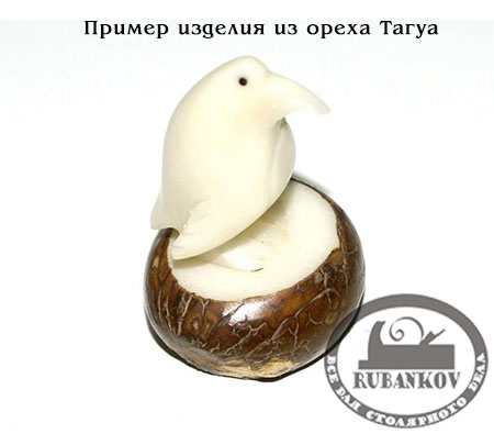 Орехи не расслаиваются, стойки к ударам и легко поддаются пилению, токарной обработке, фрезерованию и окрашиванию. При длительном нахождении под лучами солнца орехи приобретают более темный оттенок, а нагревание на огне придает светло-коричневый оттенок, в котором различим муаровый рисунок. Также орехи абсолютно не токсичны, а все вместе это делает орехи Тагуа отличным выбором при производстве игрушек, нэцкэ, шахматных фигур, брелков, украшений и прочих декоративных предметов.