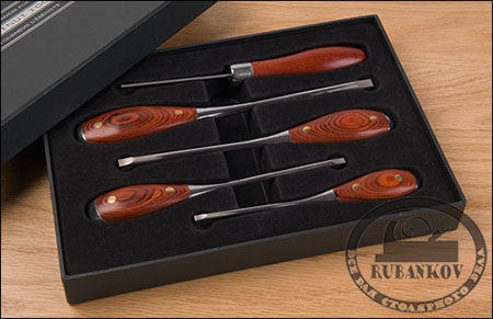 Набор плоских отверток для винтов и шурупов с плоским шлицем. В набор входят четыре отвертки и инструмент для наводки грани наконечника. Размеры наконечников - 7x1.2мм, 6x1мм, 5x0.8мм, и 4x0.6мм. Наводка грани осуществляется для создания микро заусенцев (как при заточке цикли) для предотвращения горизонтального и вертикального скольжения отвертки при закручивании. Стержень отверток выполнен из нержавеющей стали. Диаметры стержней совпадают с шириной наконечников для предотвращения повреждения кромки зенкованного отверстия. Надежный хват отвертки благодаря овальной форме рукоятей с деревянными накладками. В комплекте с отвертками идет подарочный кейс.